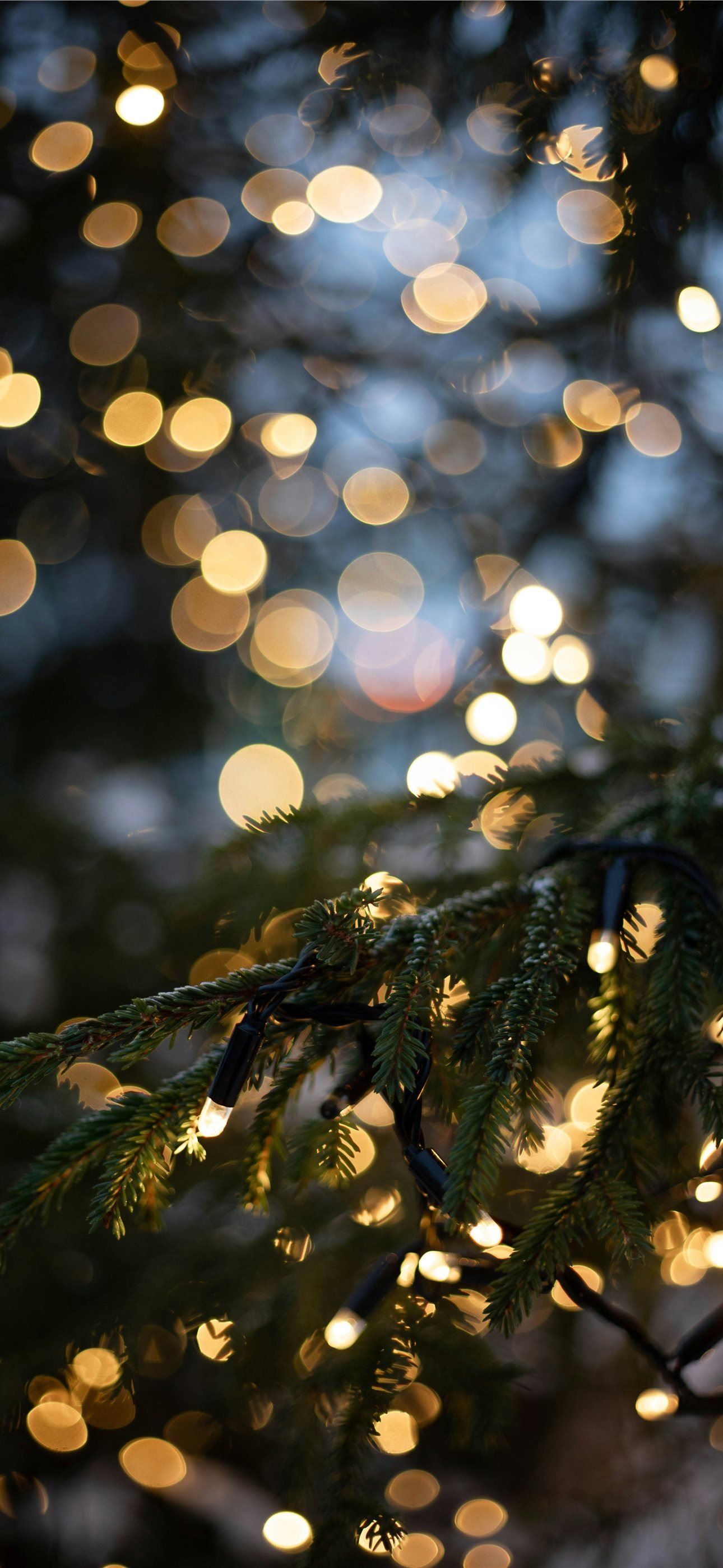 1290x2796 a close up of a pine tree with lights in the backg... - christmas tree iPhone Wallpaper