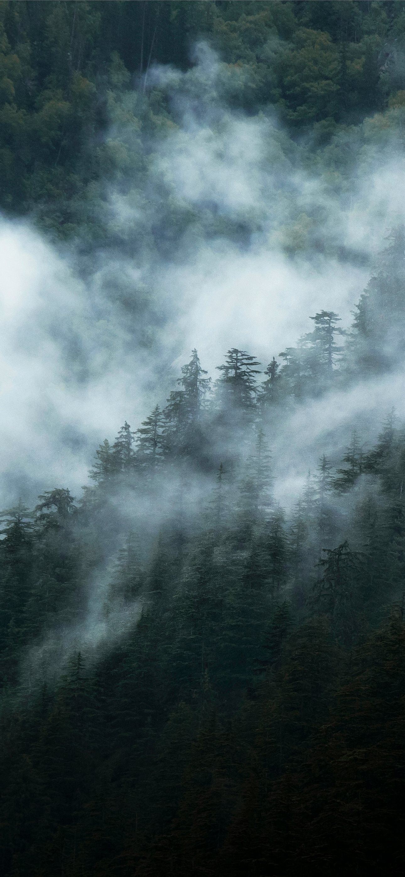 1290x2796 a mountain covered in fog with trees in the backgr... - clouds iPhone Wallpaper
