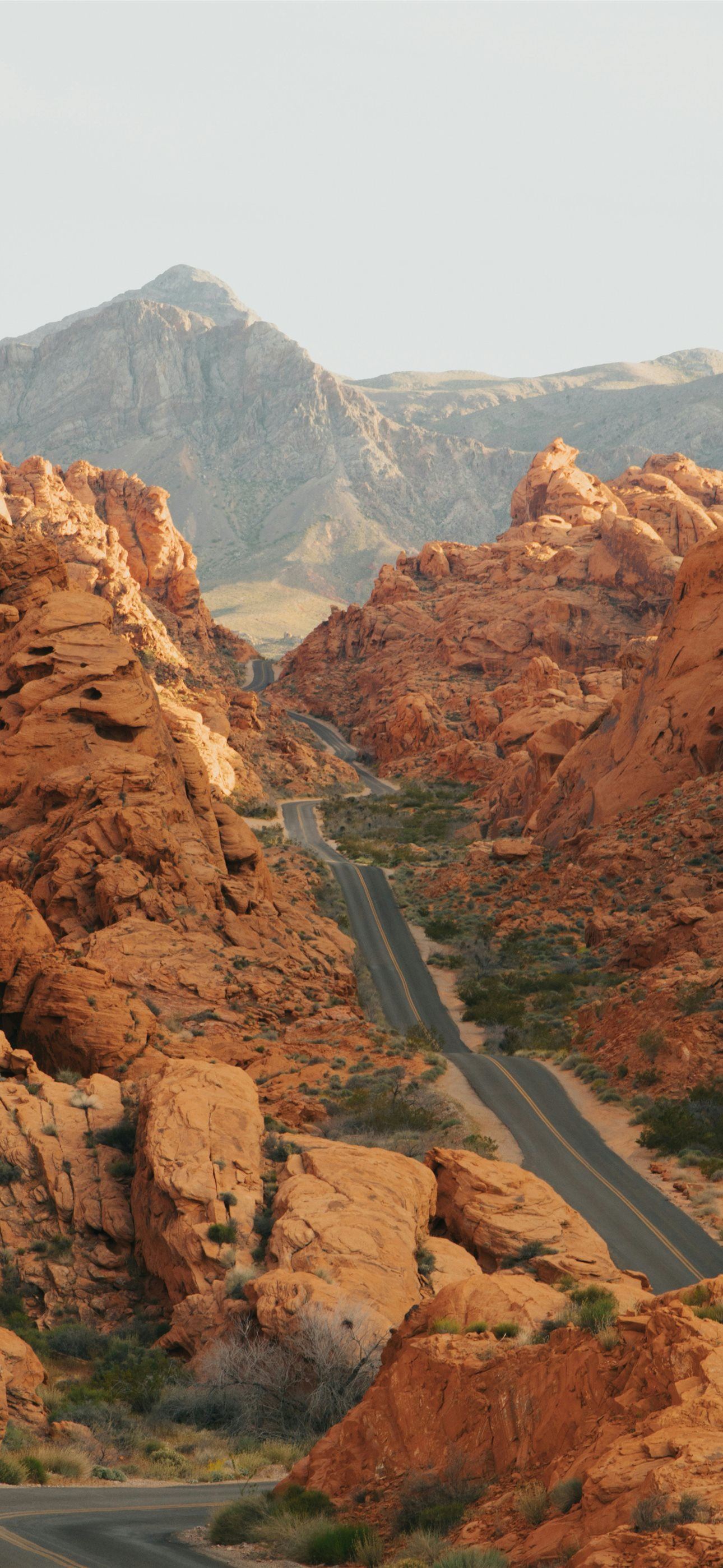 gray road in between brown rocky mountains during ... iPhone wallpaper