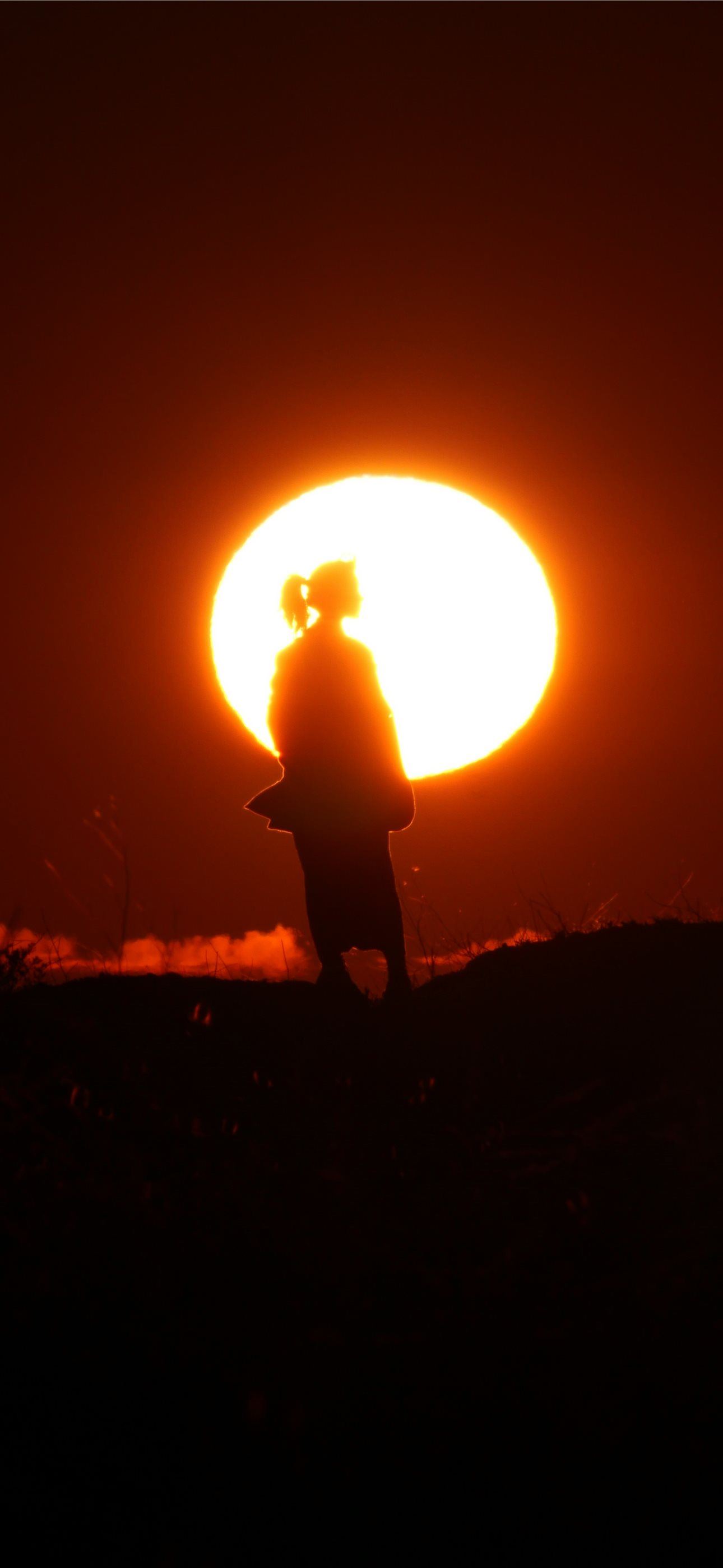 A person standing in a field with the sun in the b... iPhone wallpaper