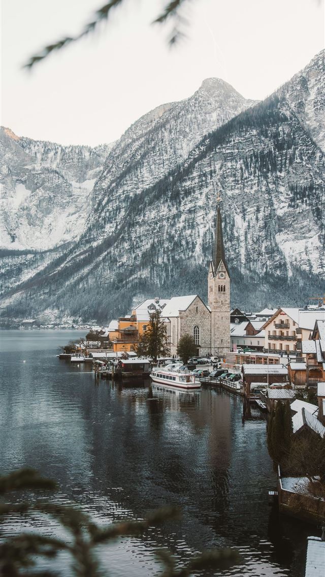 A small town on a lake surrounded by mountains iPhone wallpaper