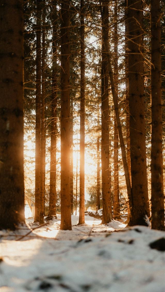 640x1136 The sun is shining through the trees in the snow -  iPhone Wallpaper