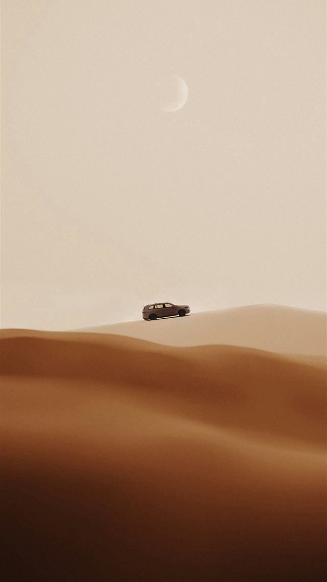 A car driving through the desert with a moon in th... iPhone wallpaper