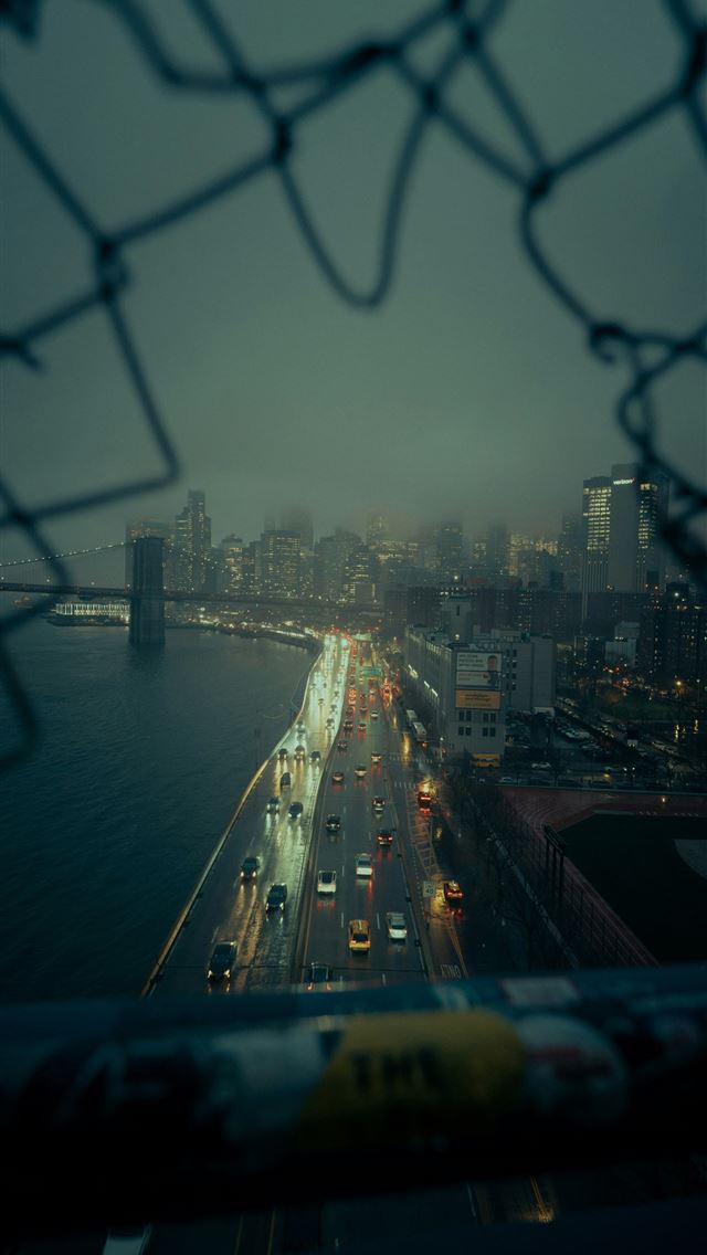 640x1136 A view of a city from behind a chain link fence -  iPhone Wallpaper