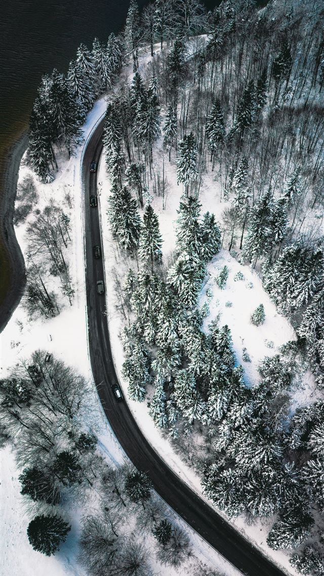 An aerial view of a snow covered forest iPhone wallpaper
