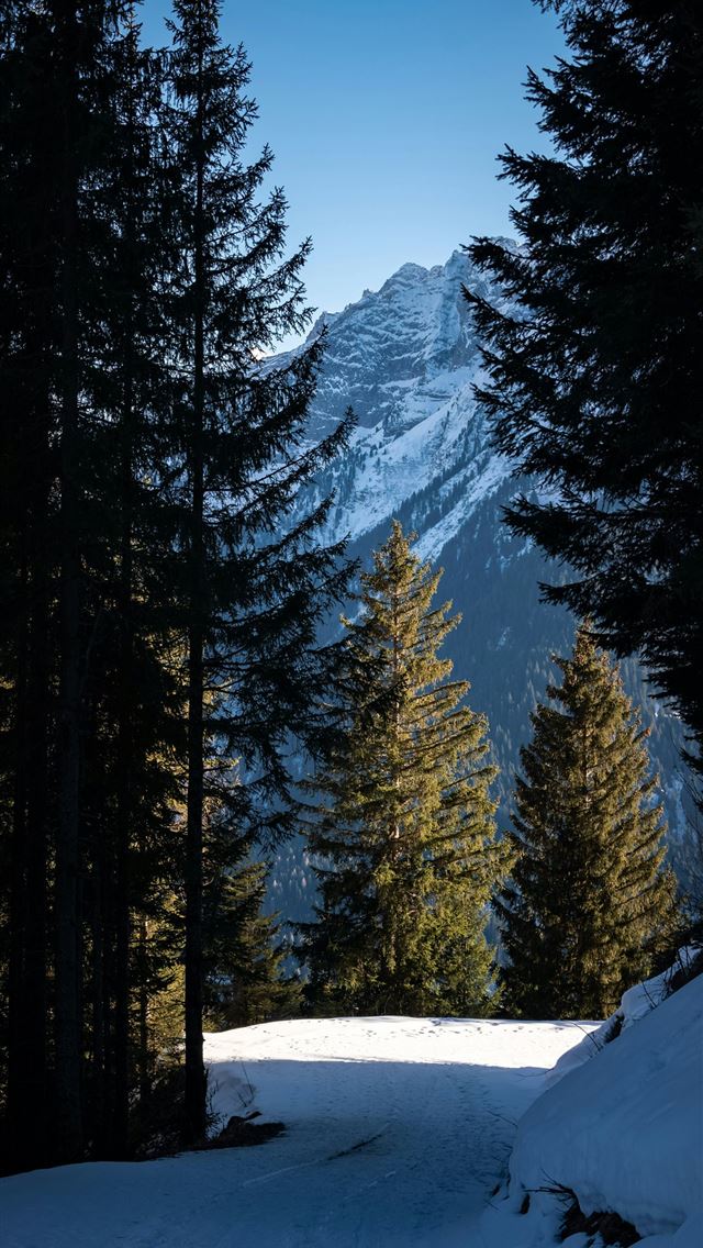 640x1136 A snow covered road surrounded by pine trees -  iPhone Wallpaper