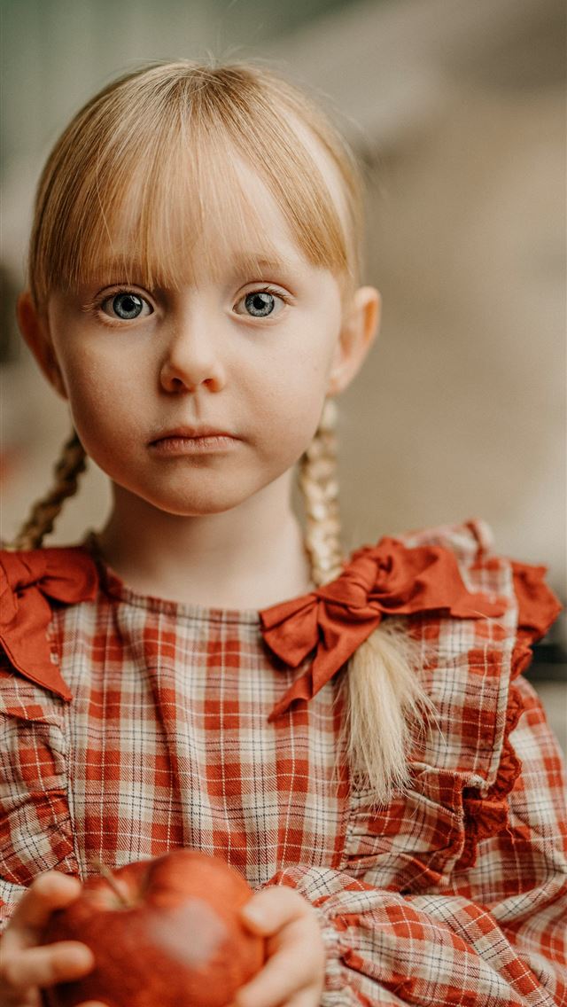 a little girl holding an apple with a sad look on ... iPhone wallpaper