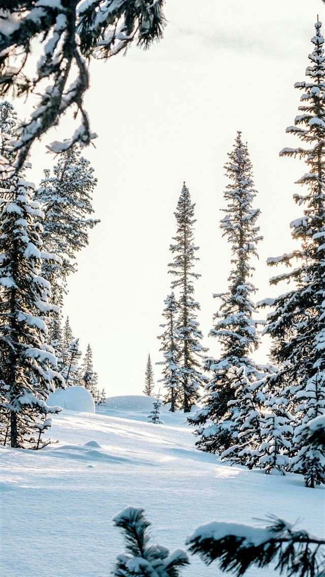 Snow covered pine trees in a serene winter forest iPhone wallpaper