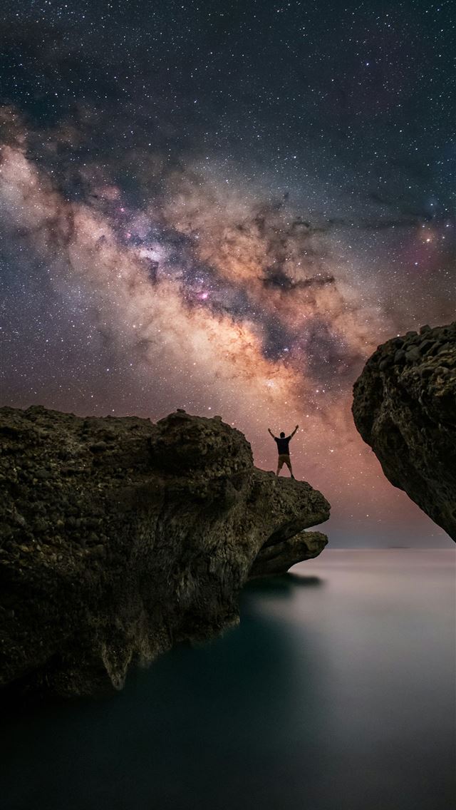 A person standing on a cliff looking at the stars iPhone wallpaper