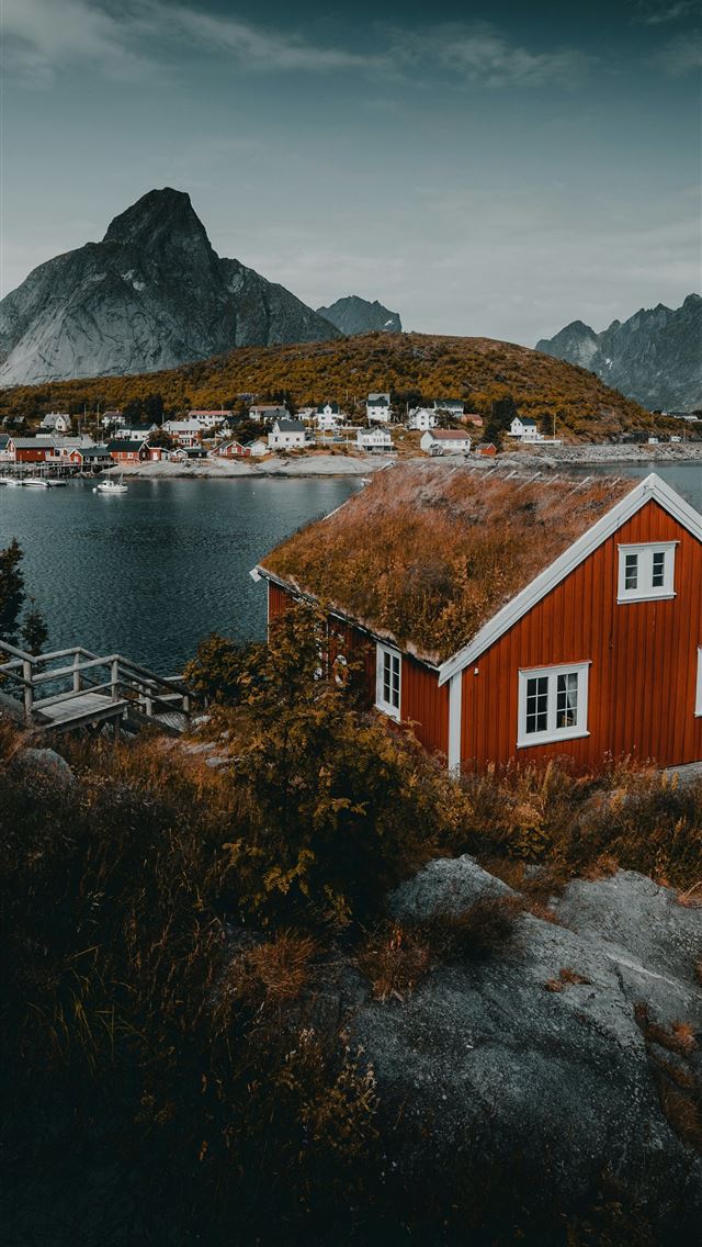 640x1136 red and white house near body of water and mountai... -  iPhone Wallpaper
