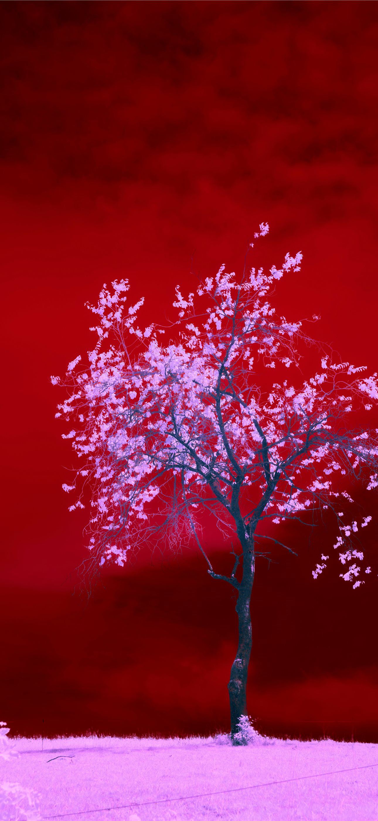 1290x2796 a tree in a field with a red sky in the background -  iPhone Wallpaper
