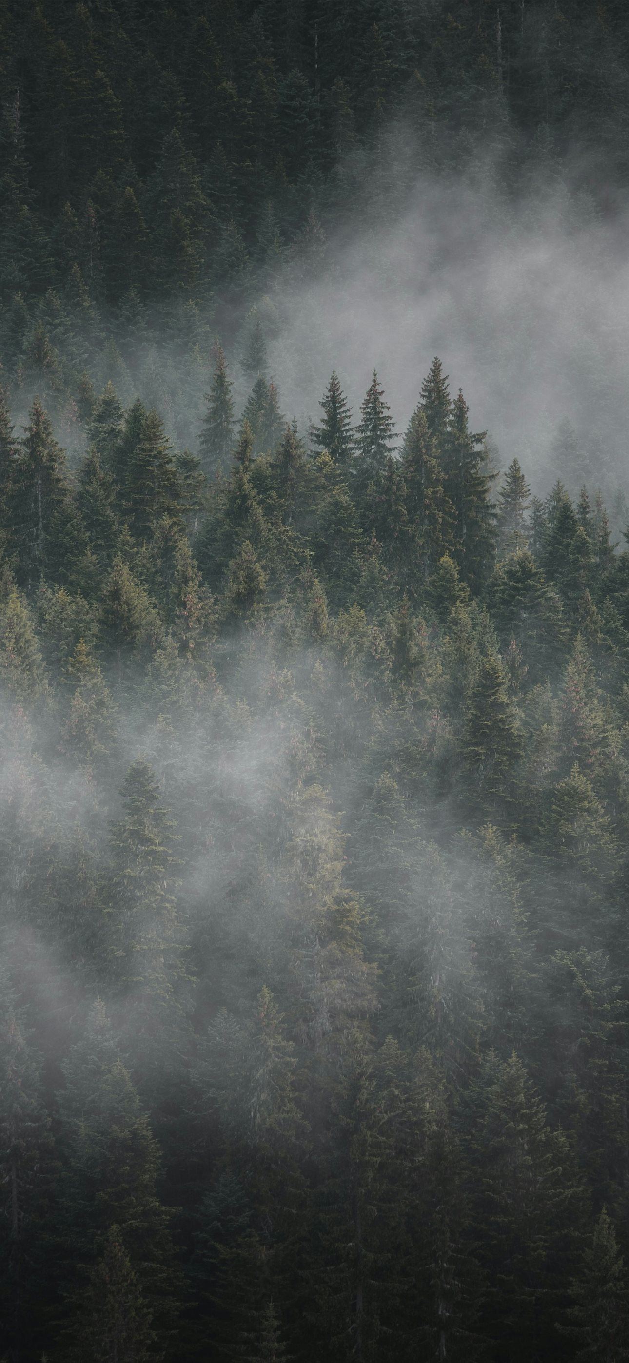 a forest filled with lots of trees covered in fog iPhone wallpaper