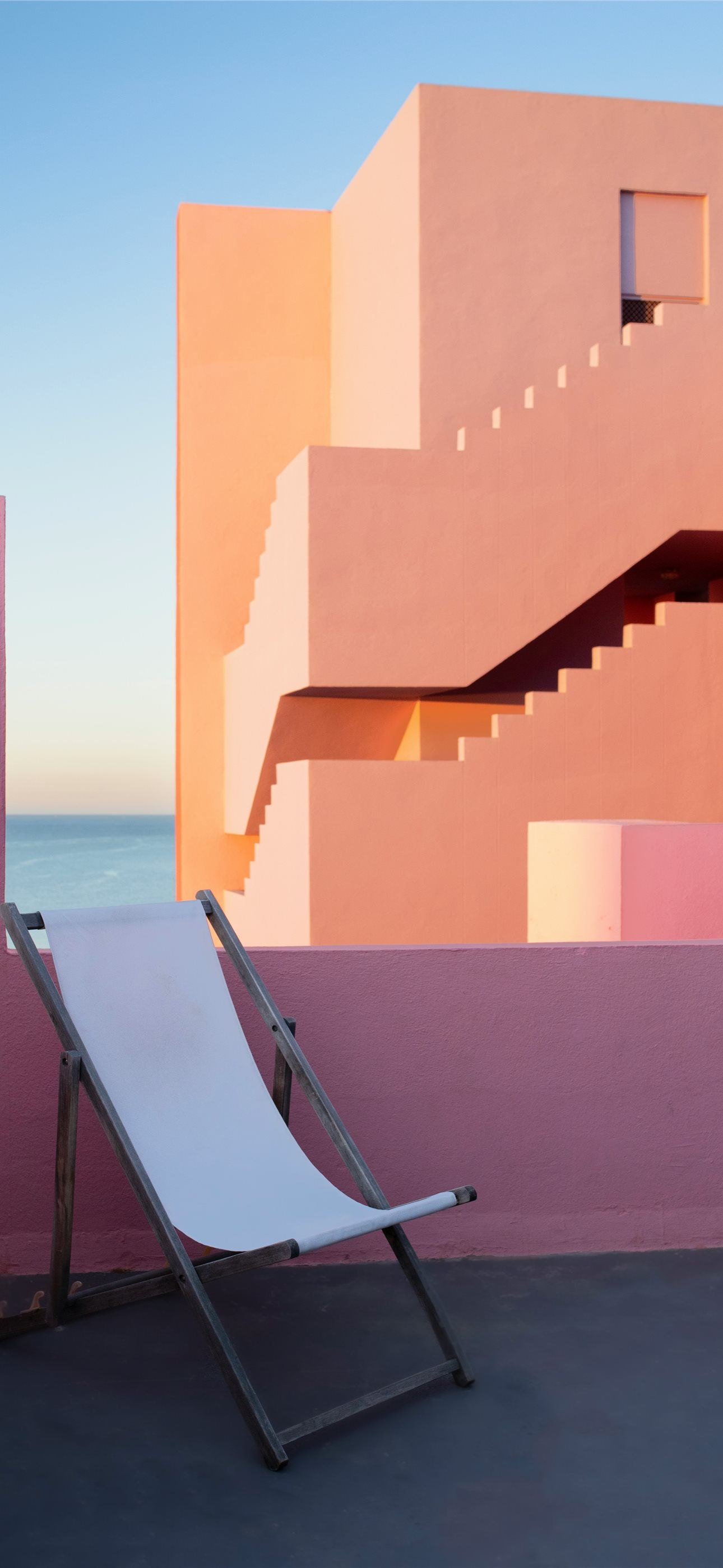 1290x2796 a white chair sitting in front of a pink building -  iPhone Wallpaper