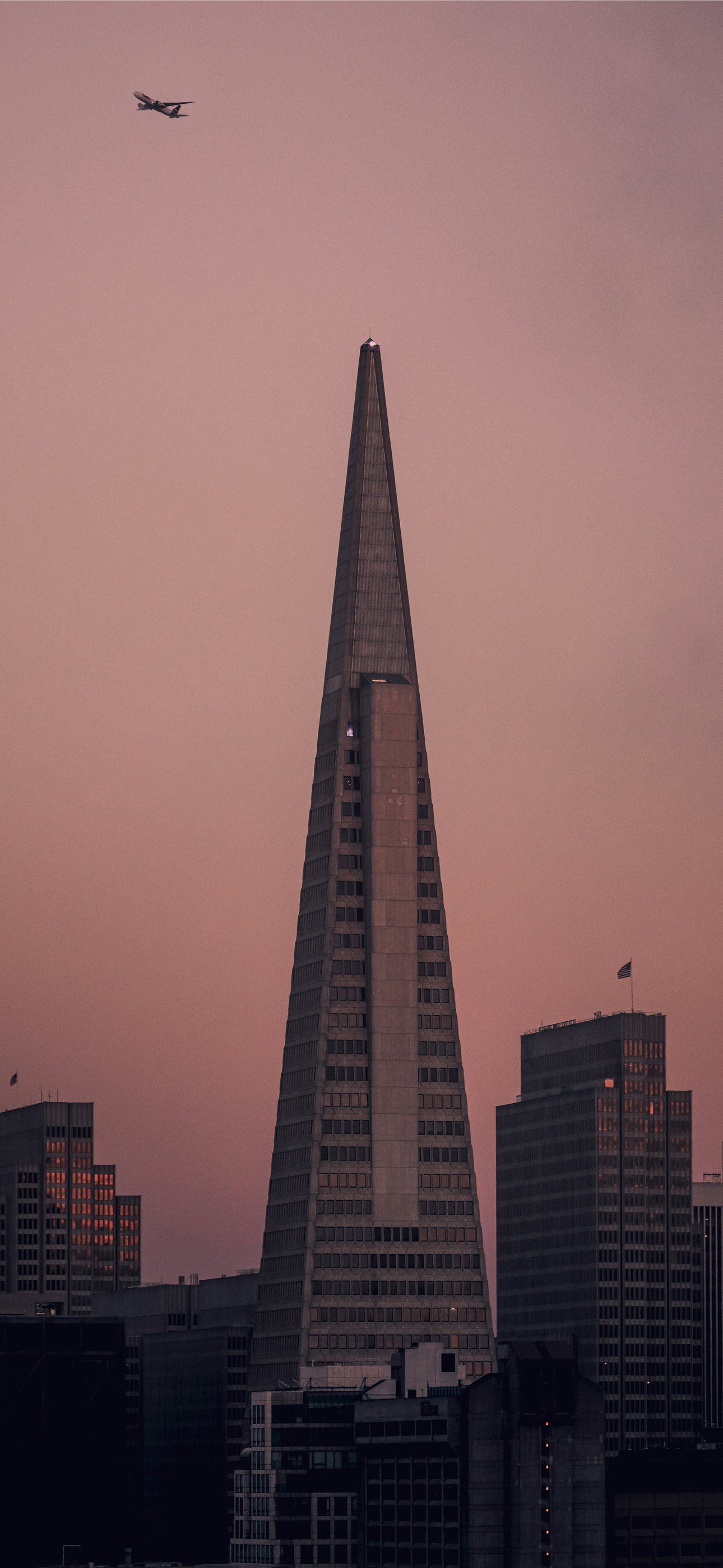 a plane flying over a city at sunset iPhone wallpaper