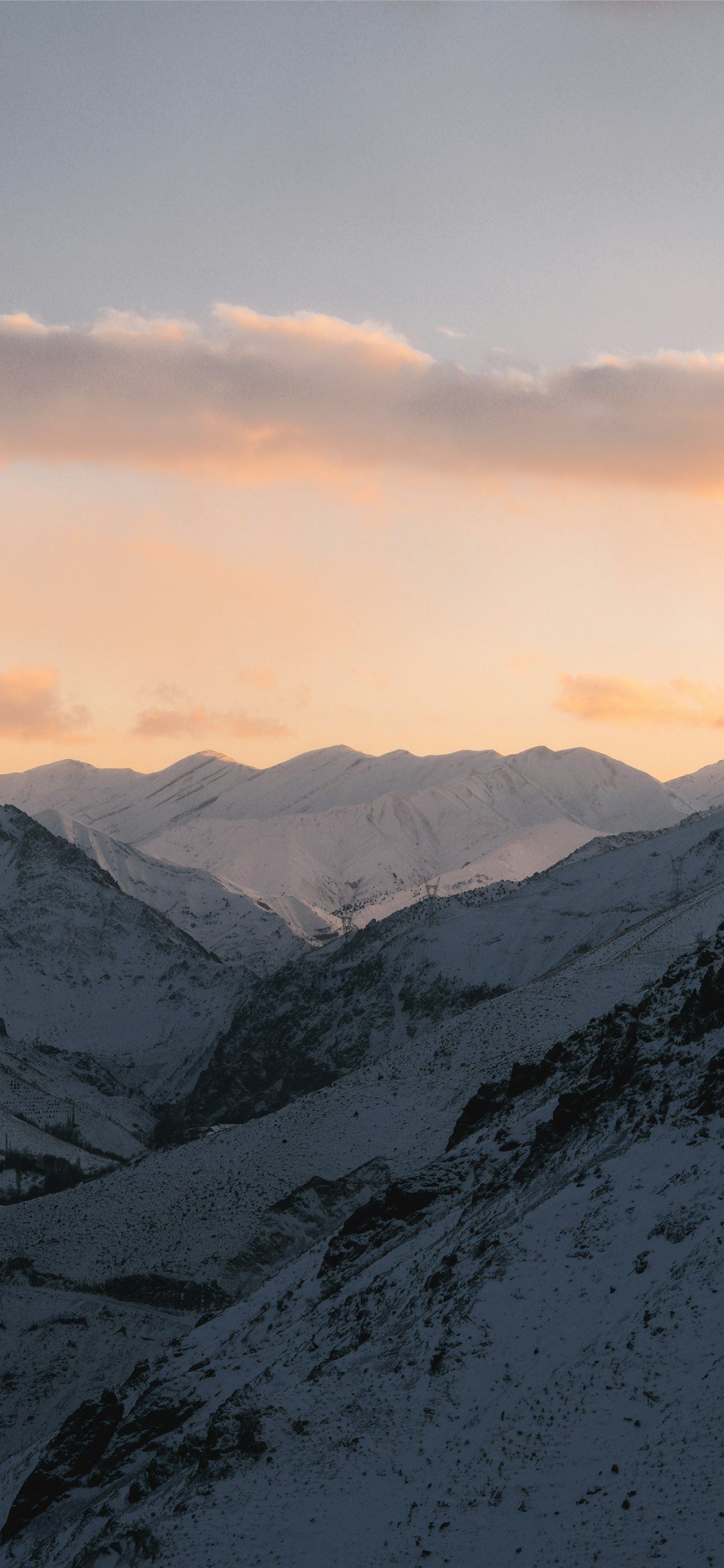 Snowy mountain valley at dusk with soft clouds iPhone wallpaper
