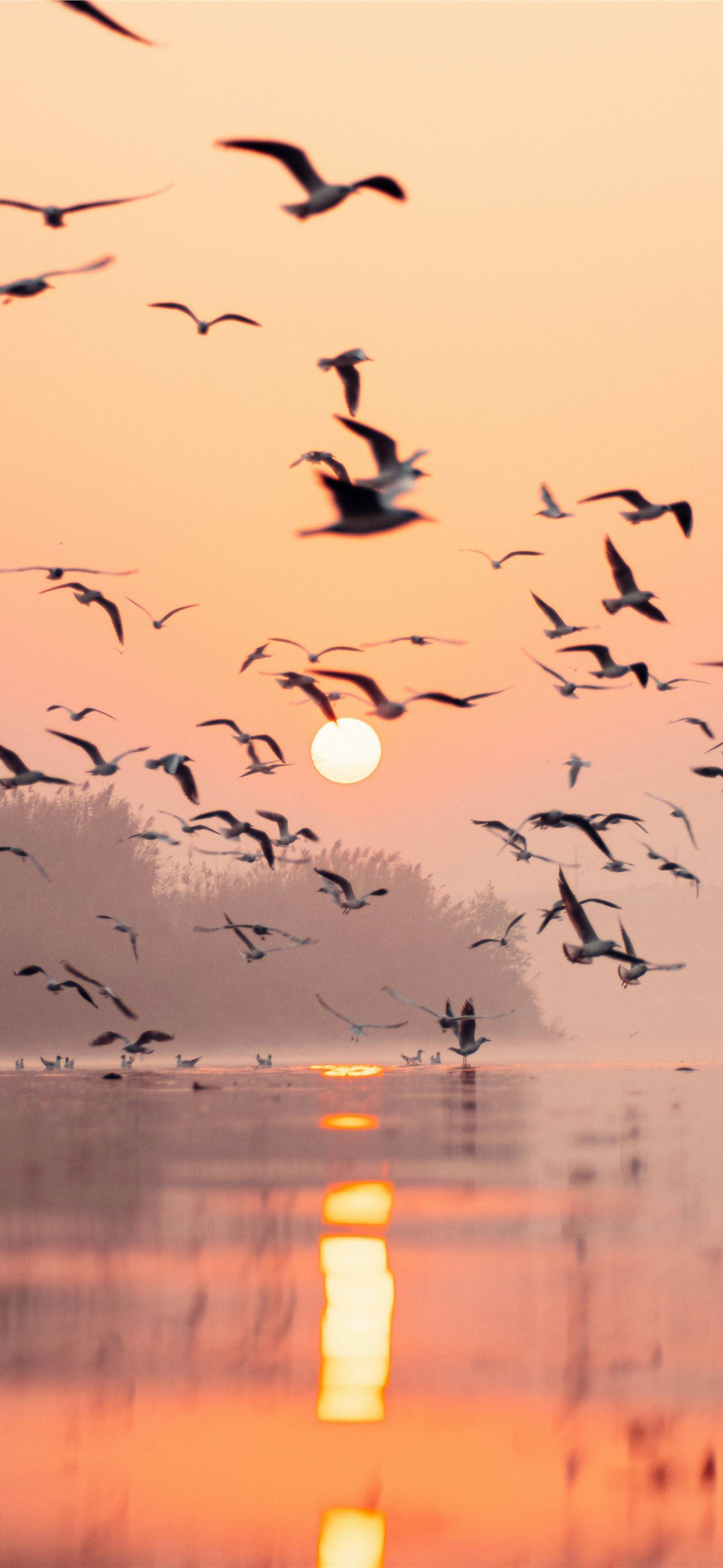 1290x2796 a flock of birds flying over a body of water -  iPhone Wallpaper
