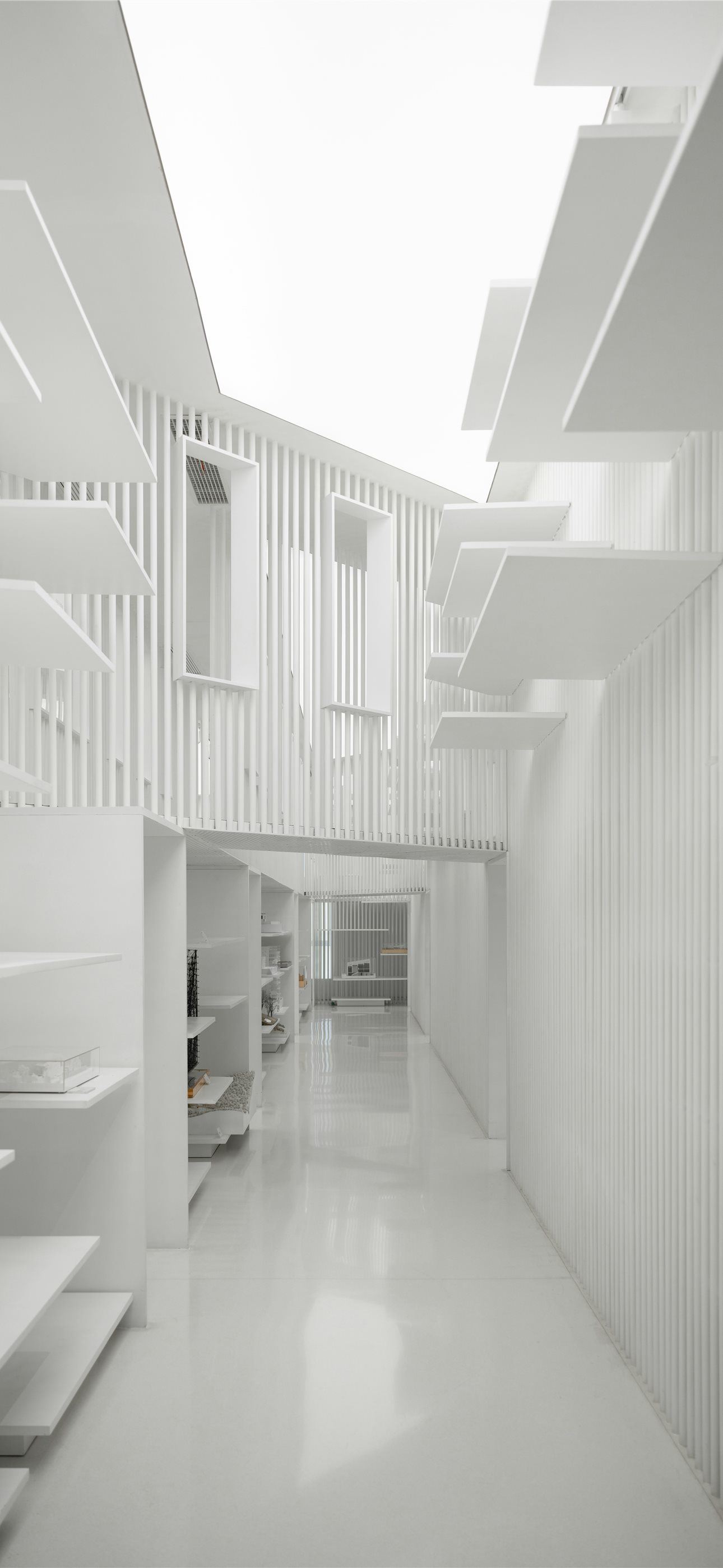 1290x2796 a long white hallway with shelves and stairs -  iPhone Wallpaper