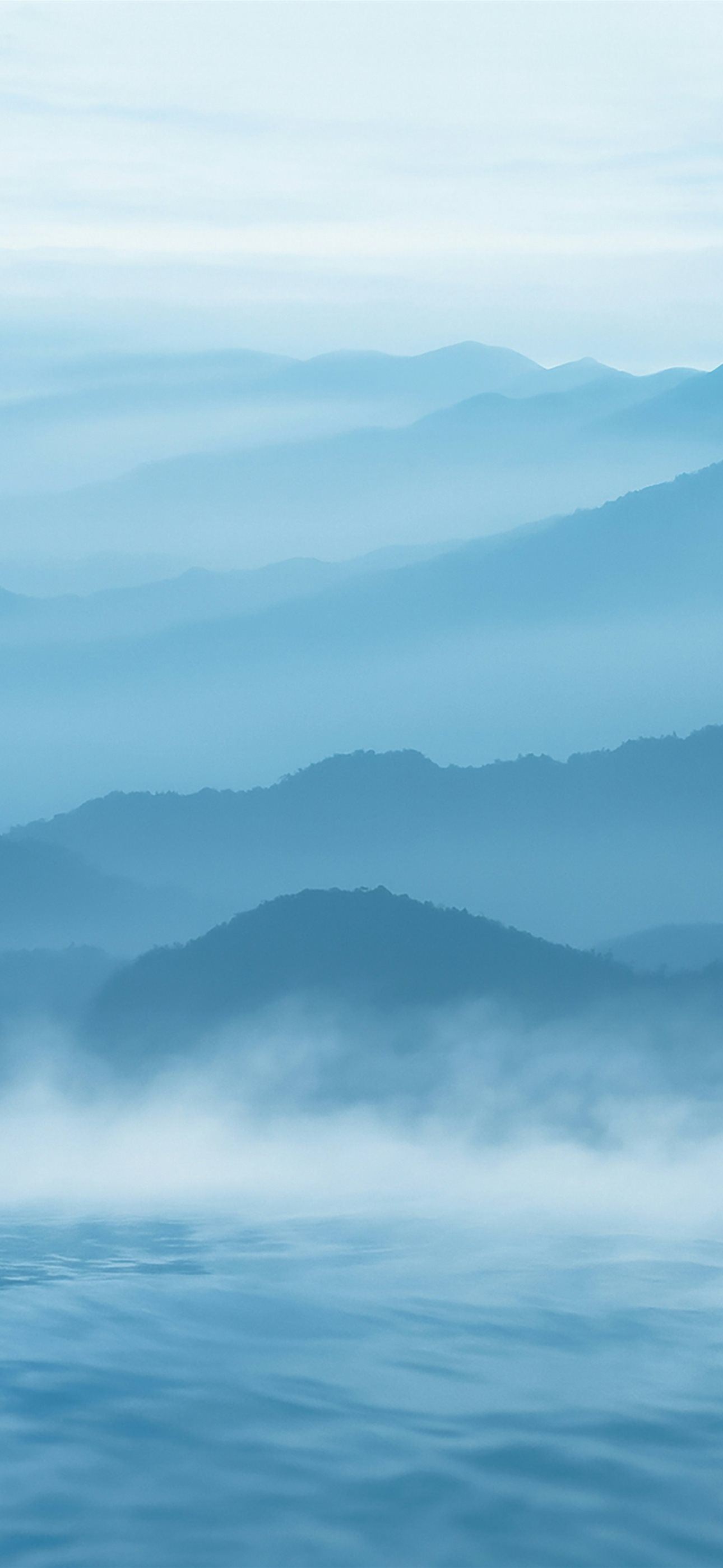 1290x2796 Misty blue mountains rise above calm water  -  iPhone Wallpaper