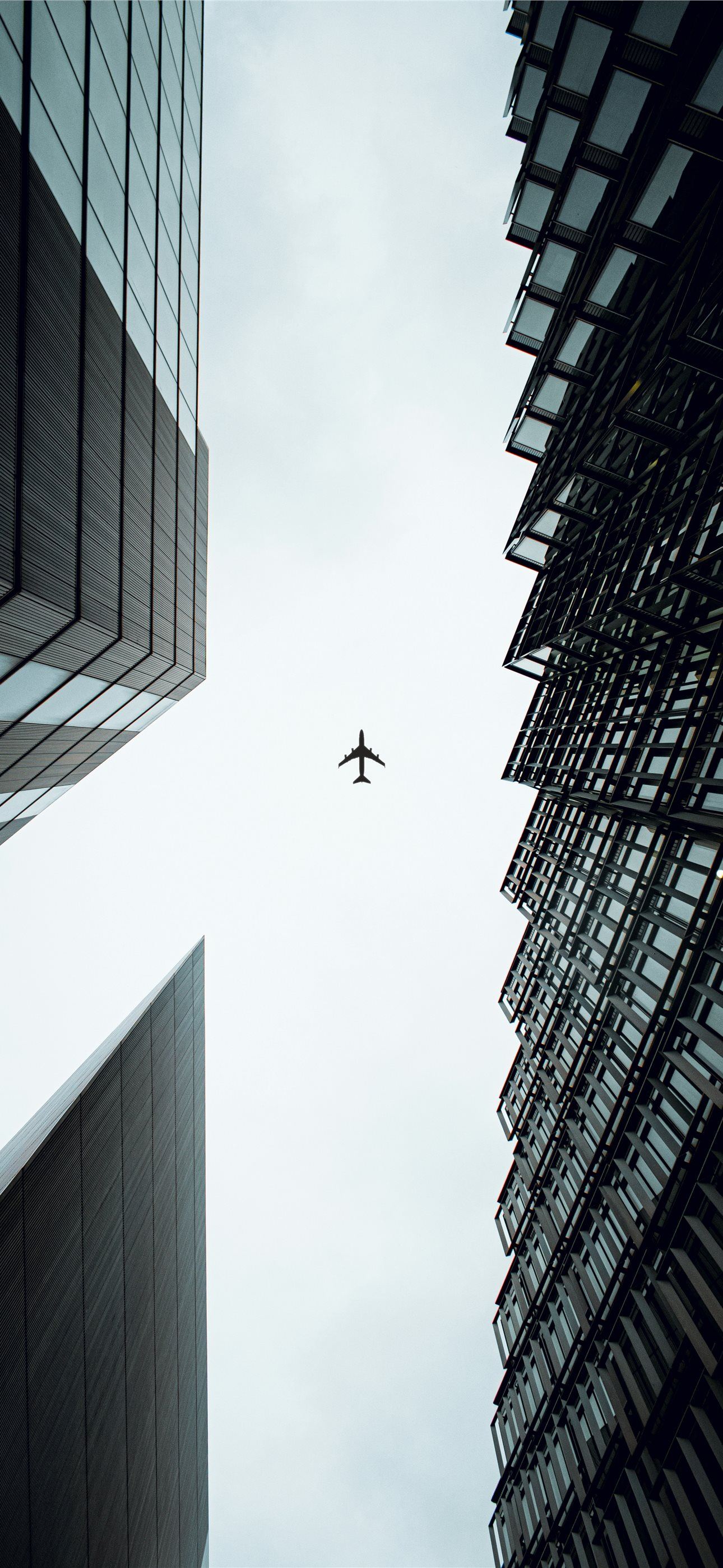 1290x2796 an airplane flying in the sky between two building... -  iPhone Wallpaper