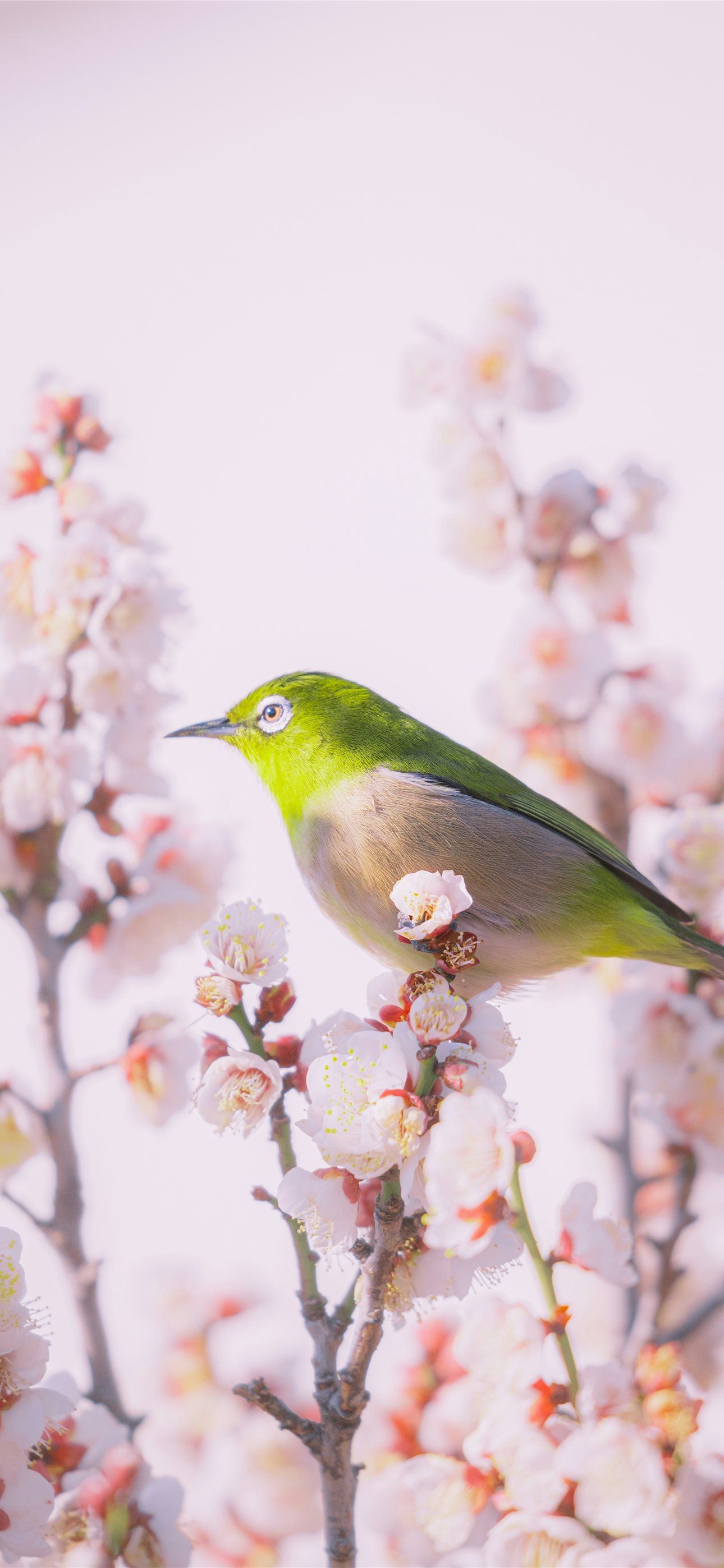 A small bird perched on a blooming cherry blossom ... iPhone wallpaper