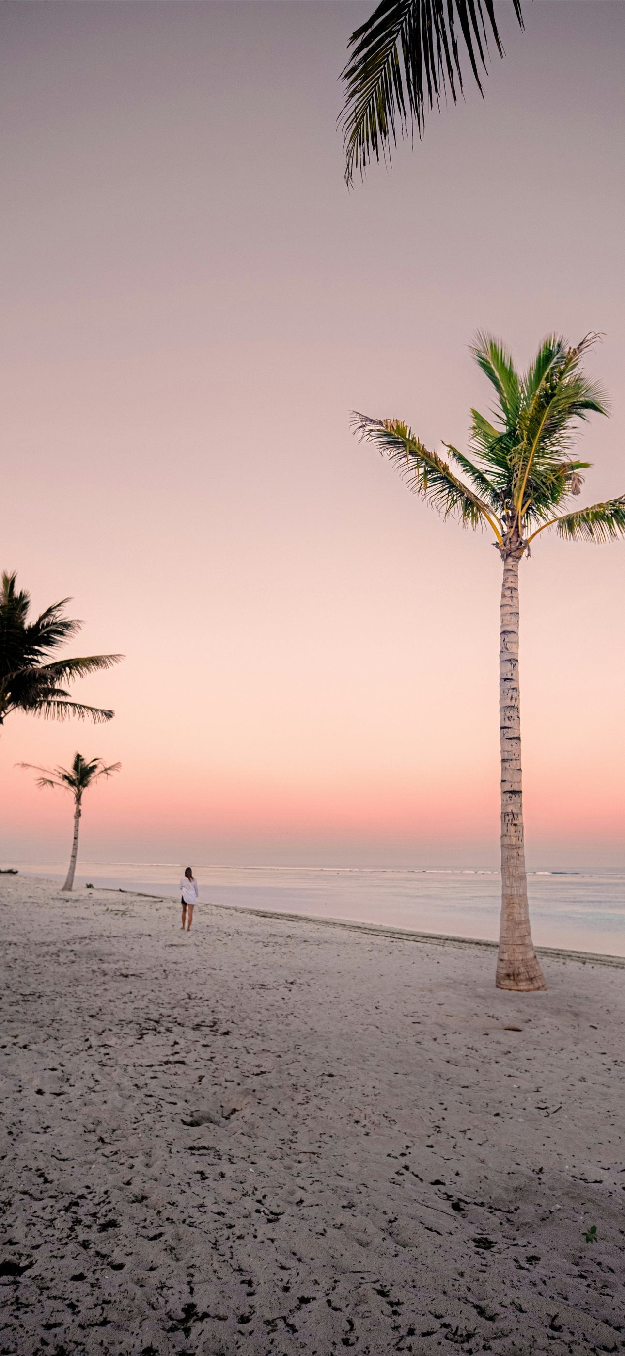 a person standing on a beach next to a palm tree iPhone wallpaper