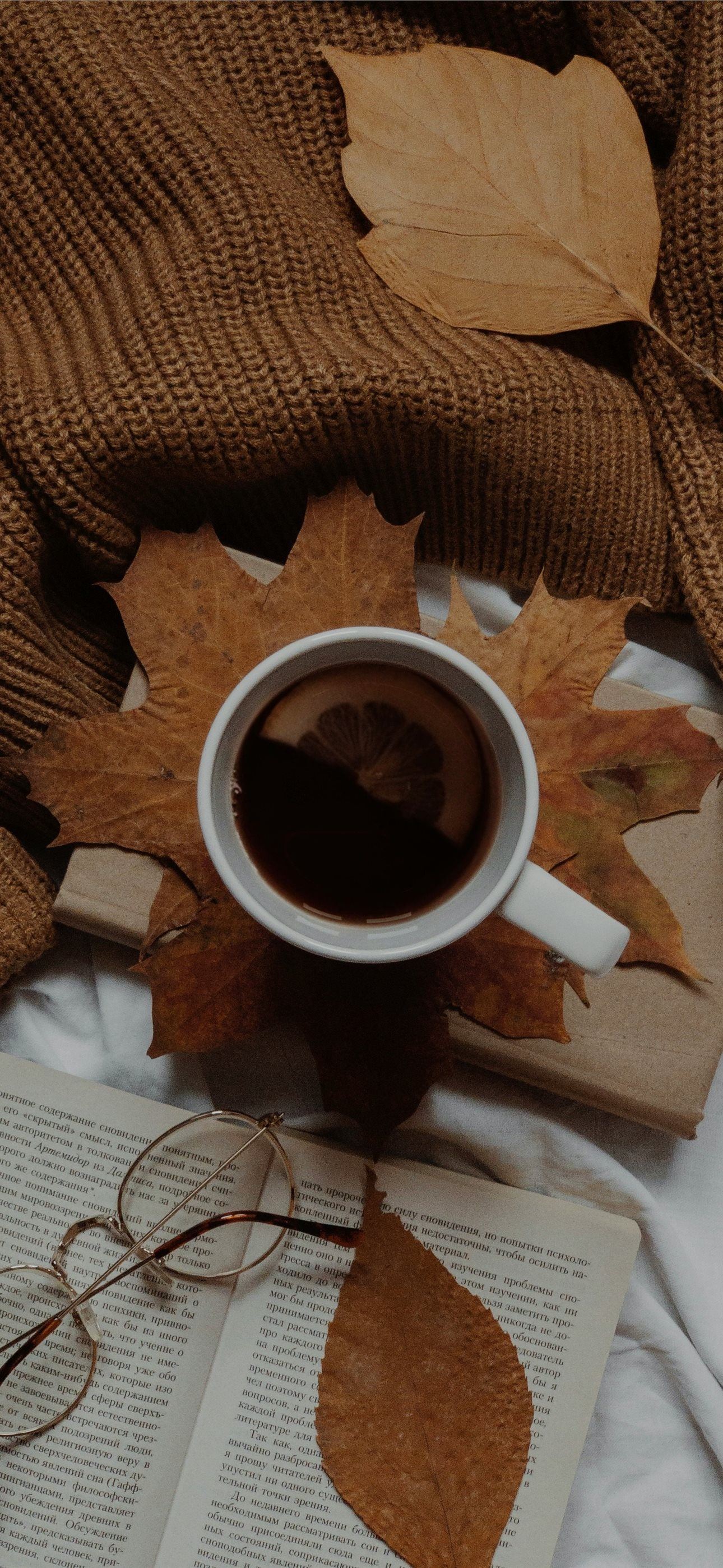 a cup of coffee and a book on a bed iPhone wallpaper