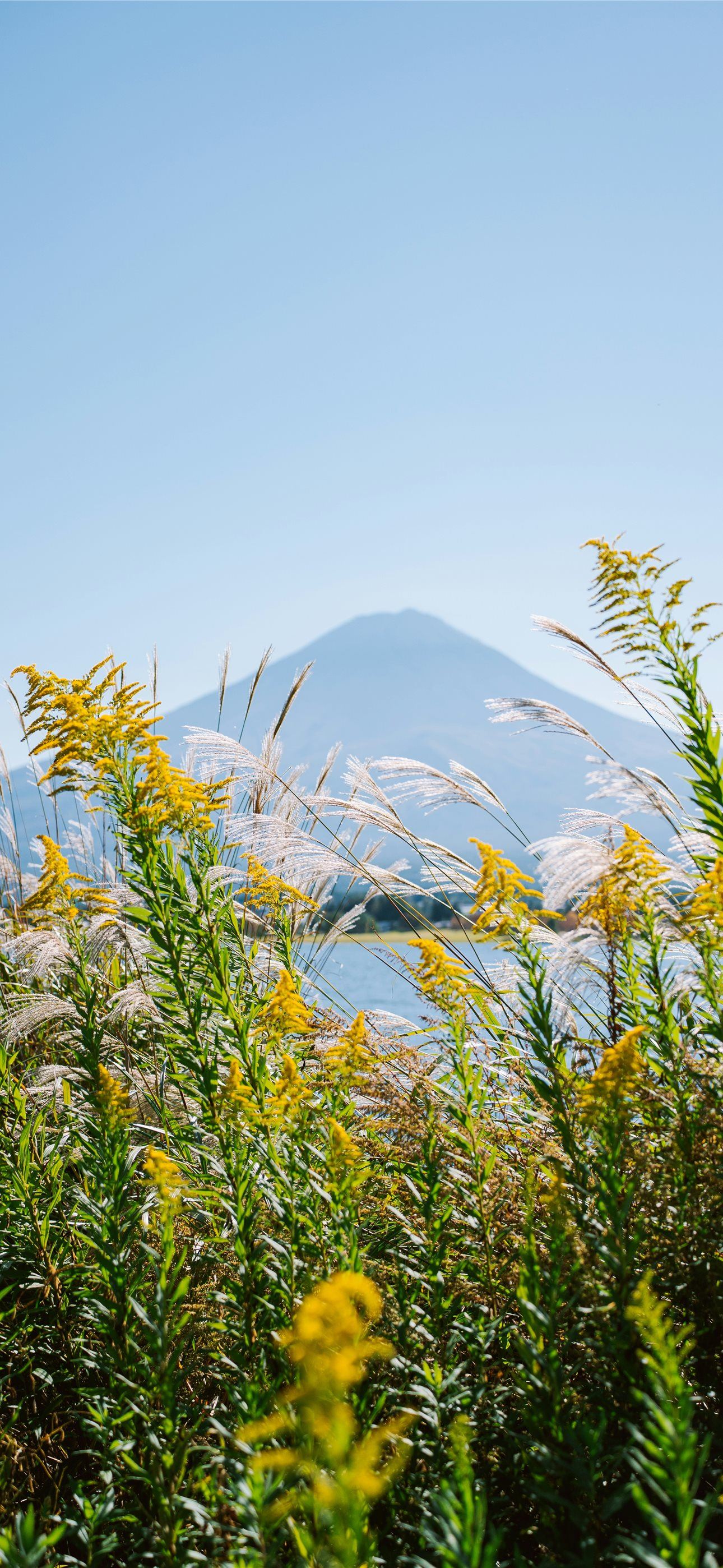 A majestic mountain peak behind wildflowers under ... iPhone wallpaper