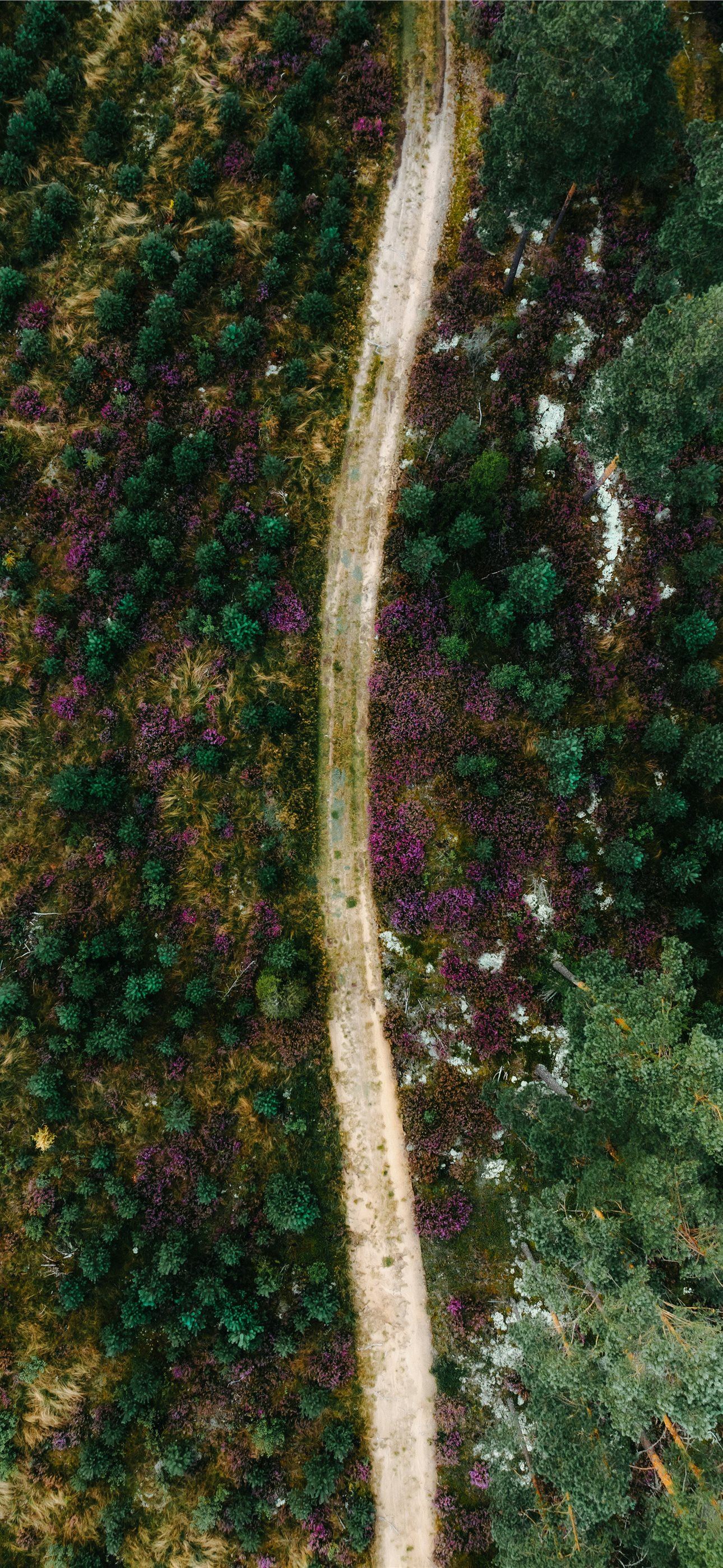1290x2796 Dirt path through a forest with purple flowers -  iPhone Wallpaper