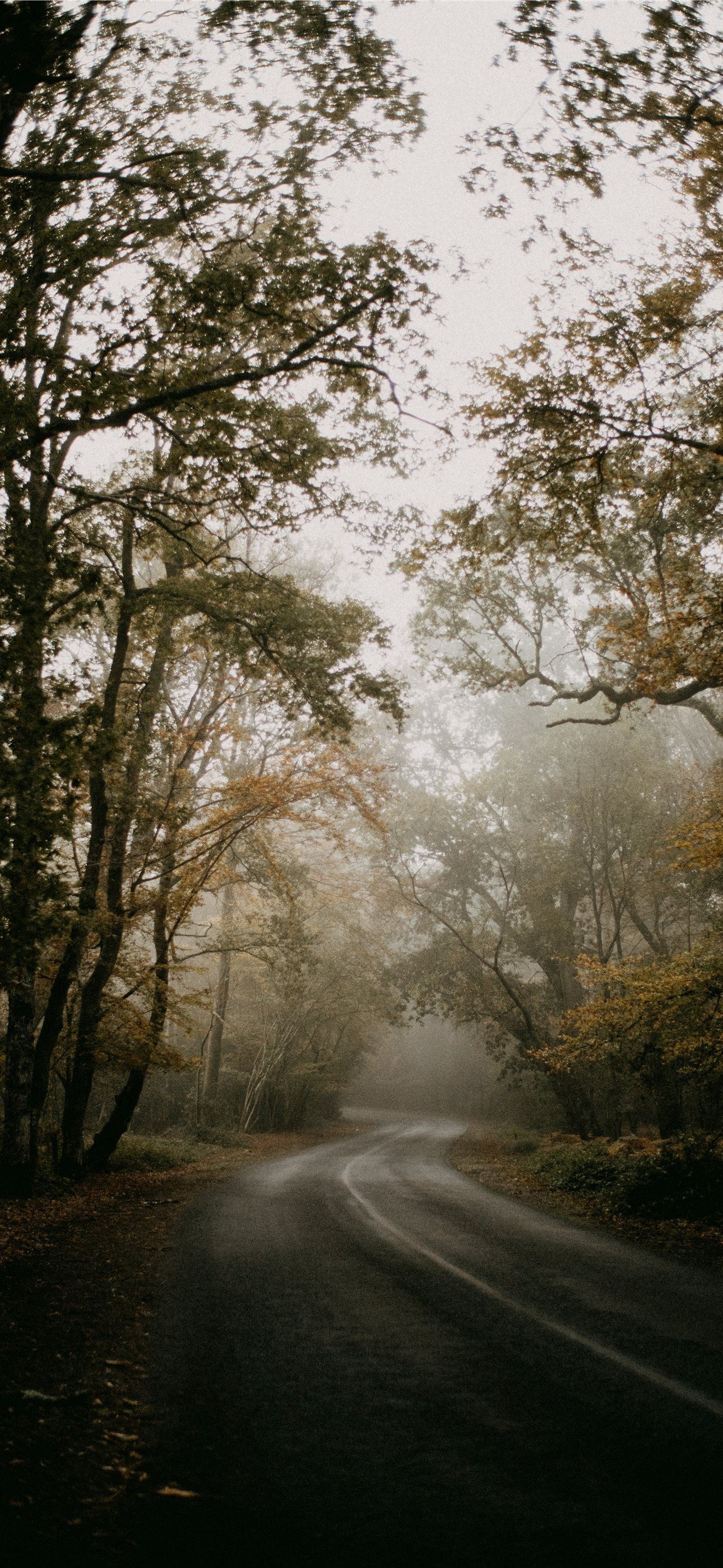 1290x2796 a road surrounded by trees in the middle of a fore... -  iPhone Wallpaper