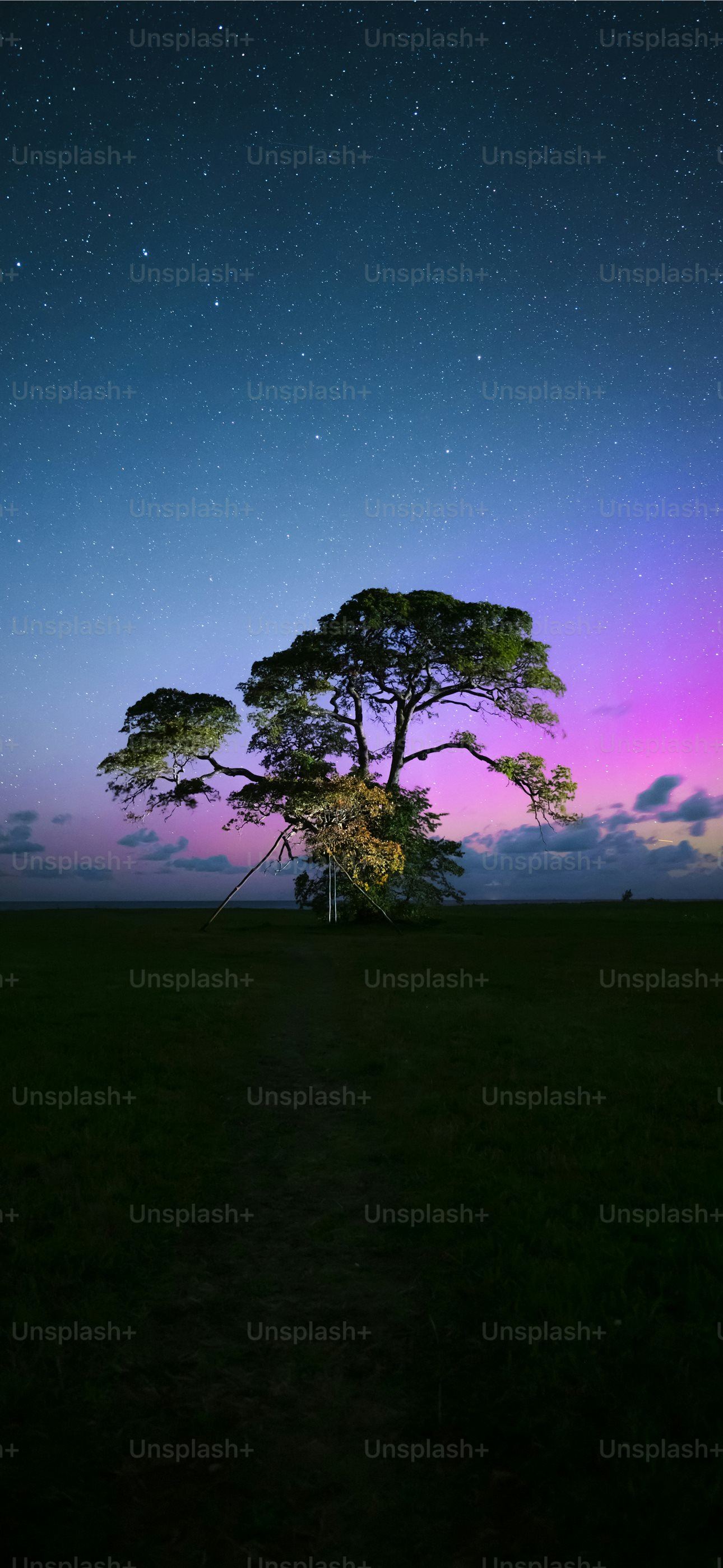 A tree in a field under a purple and blue sky iPhone wallpaper