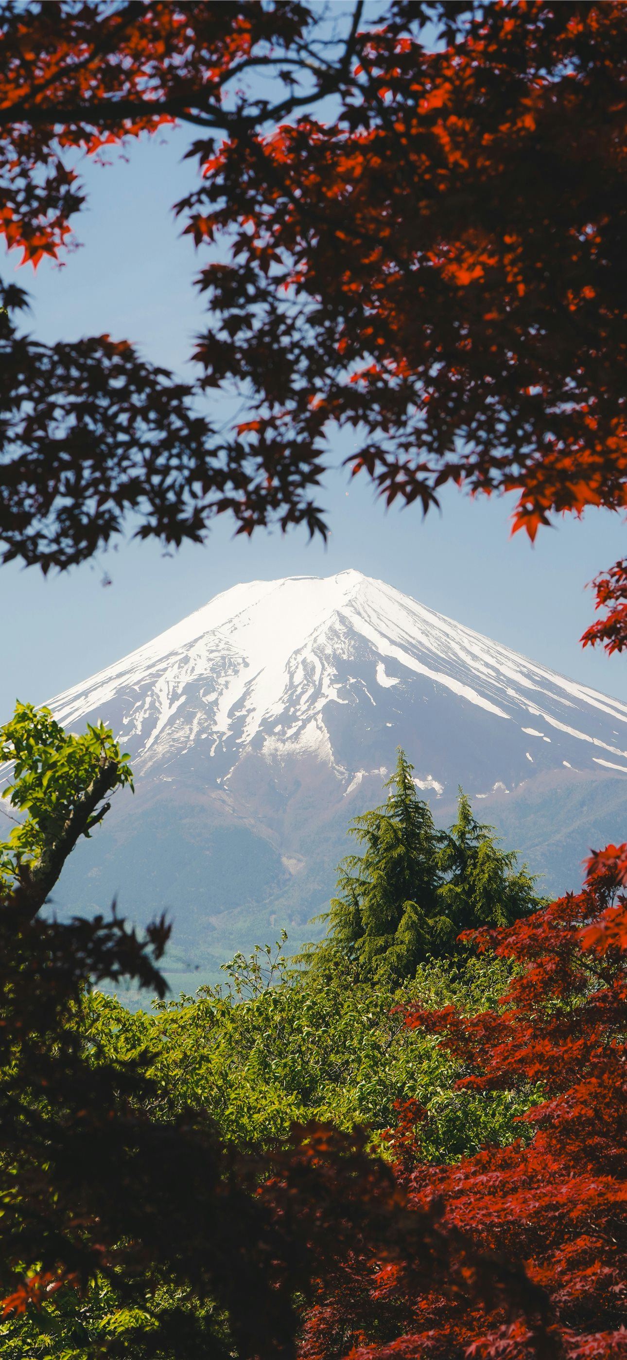 a view of a snow covered mountain through the tree... iPhone wallpaper