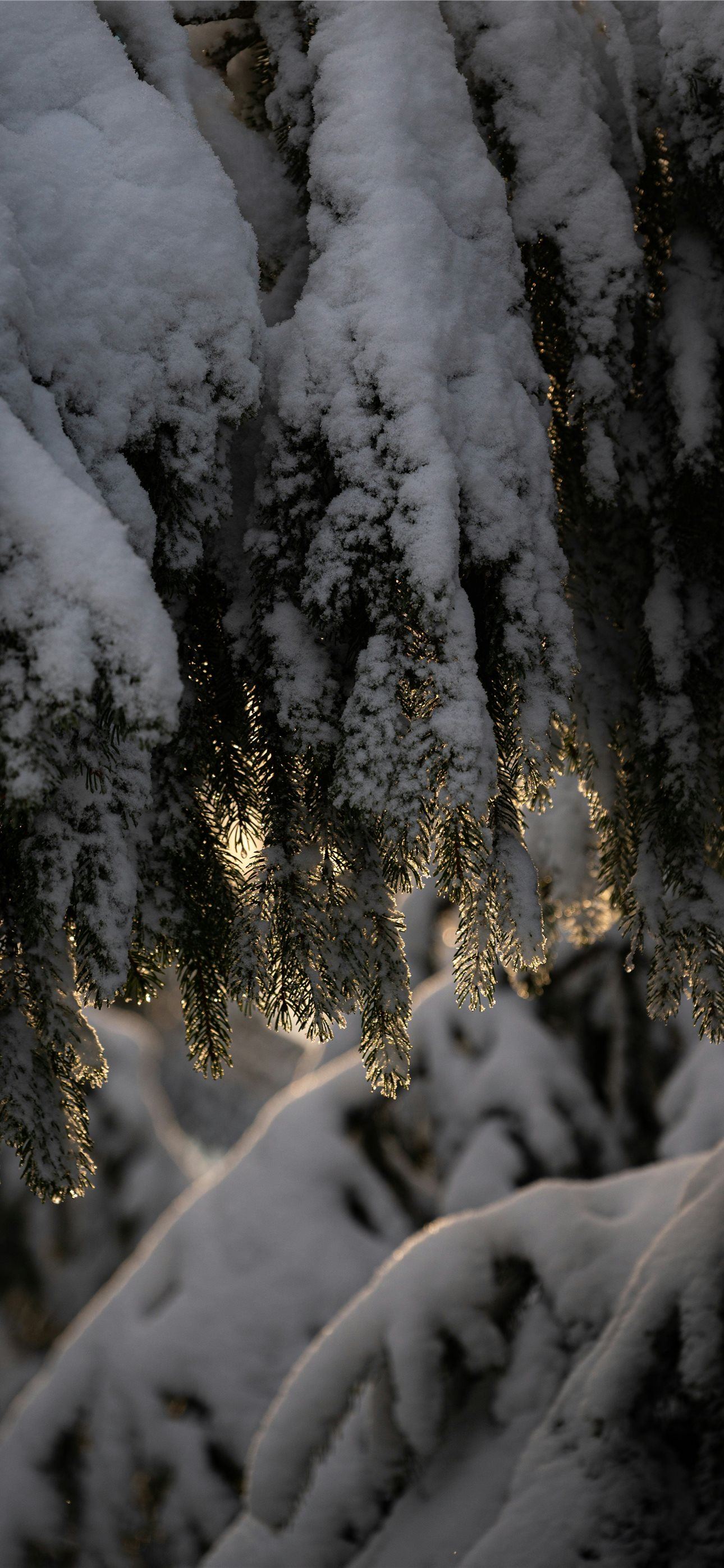 Sunlight shines through snow covered pine branches... iPhone wallpaper