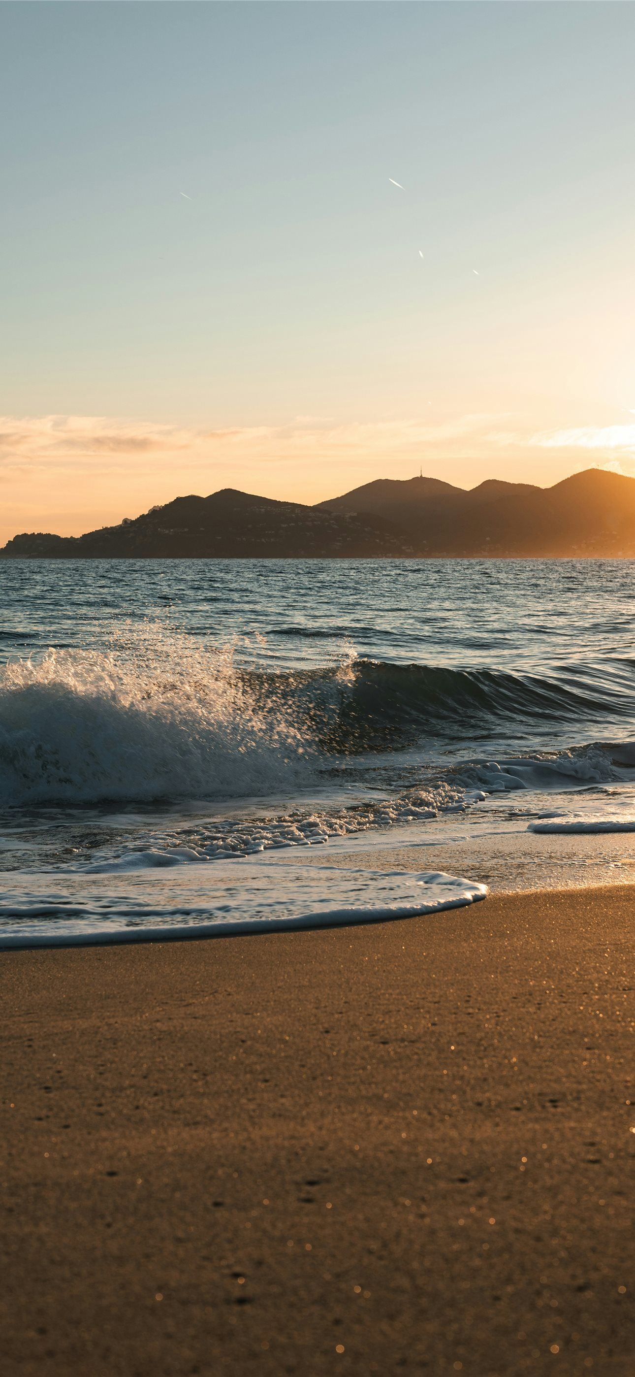 Gentle waves wash onto a sandy beach at sunset iPhone wallpaper