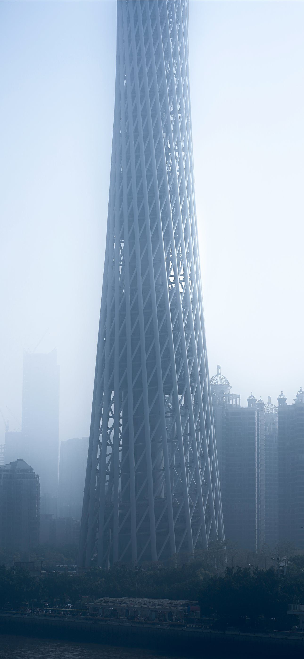 1290x2796 a very tall building in the middle of a foggy city -  iPhone Wallpaper