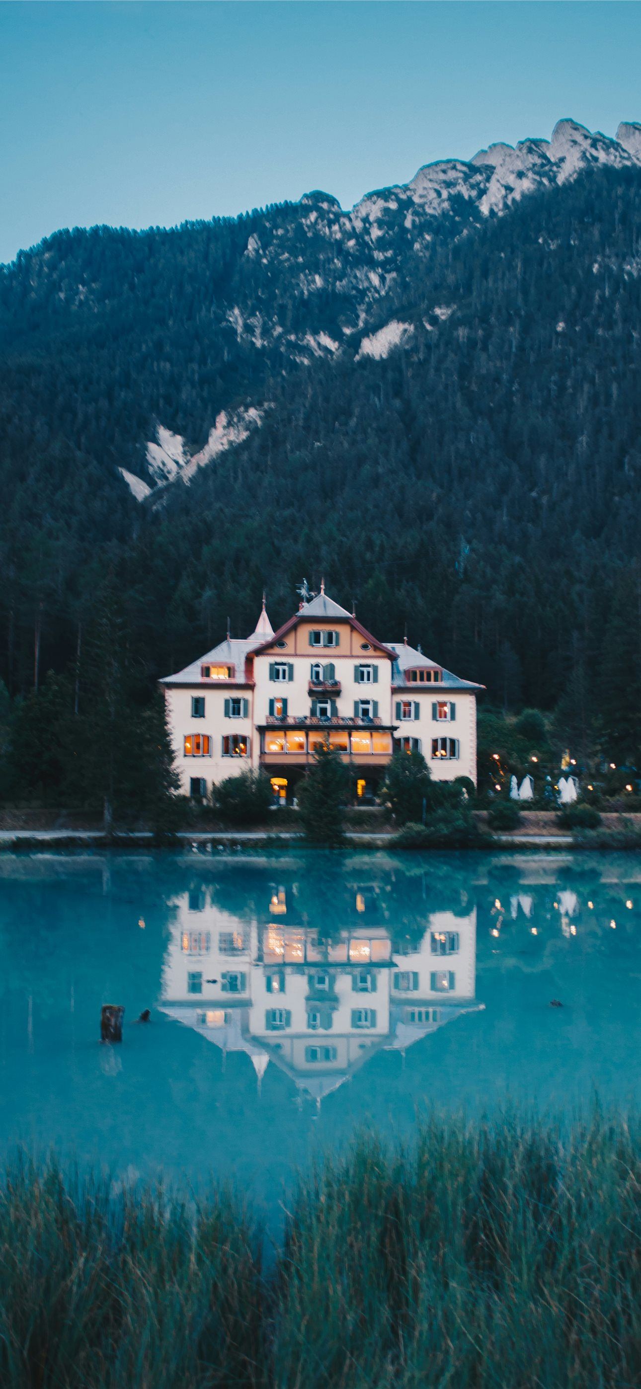 1290x2796 white and gray hotel by a lake -  iPhone Wallpaper