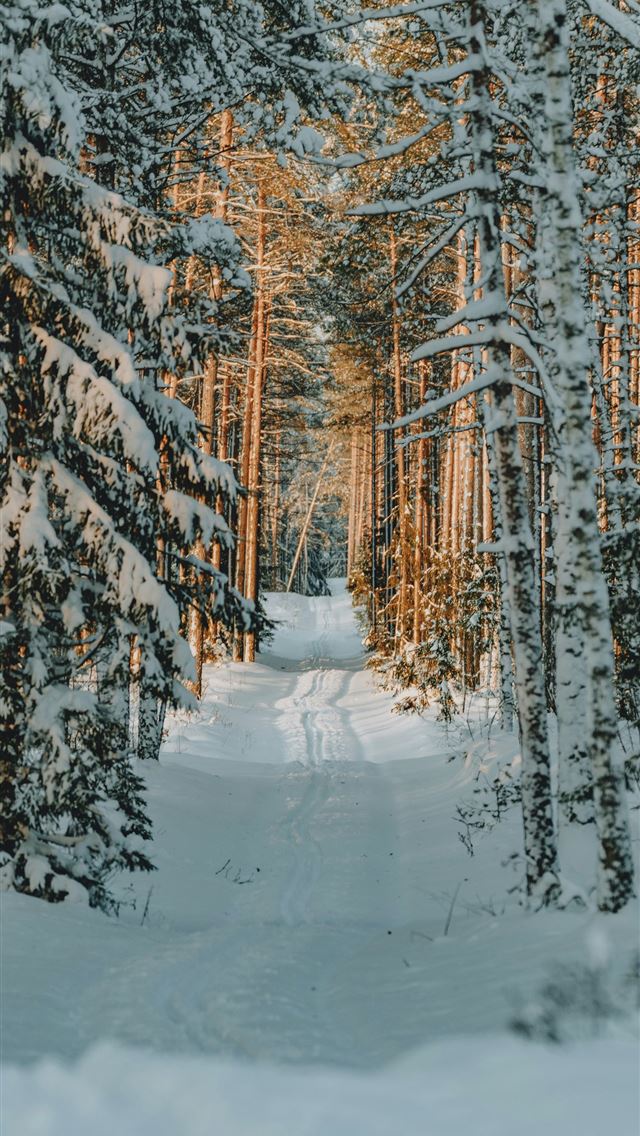 a path through a snowy forest with lots of trees iPhone wallpaper