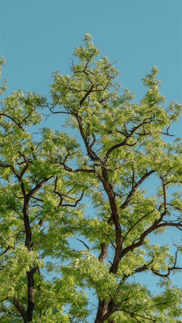 a tall tree with green leaves against a blue sky iPhone wallpaper