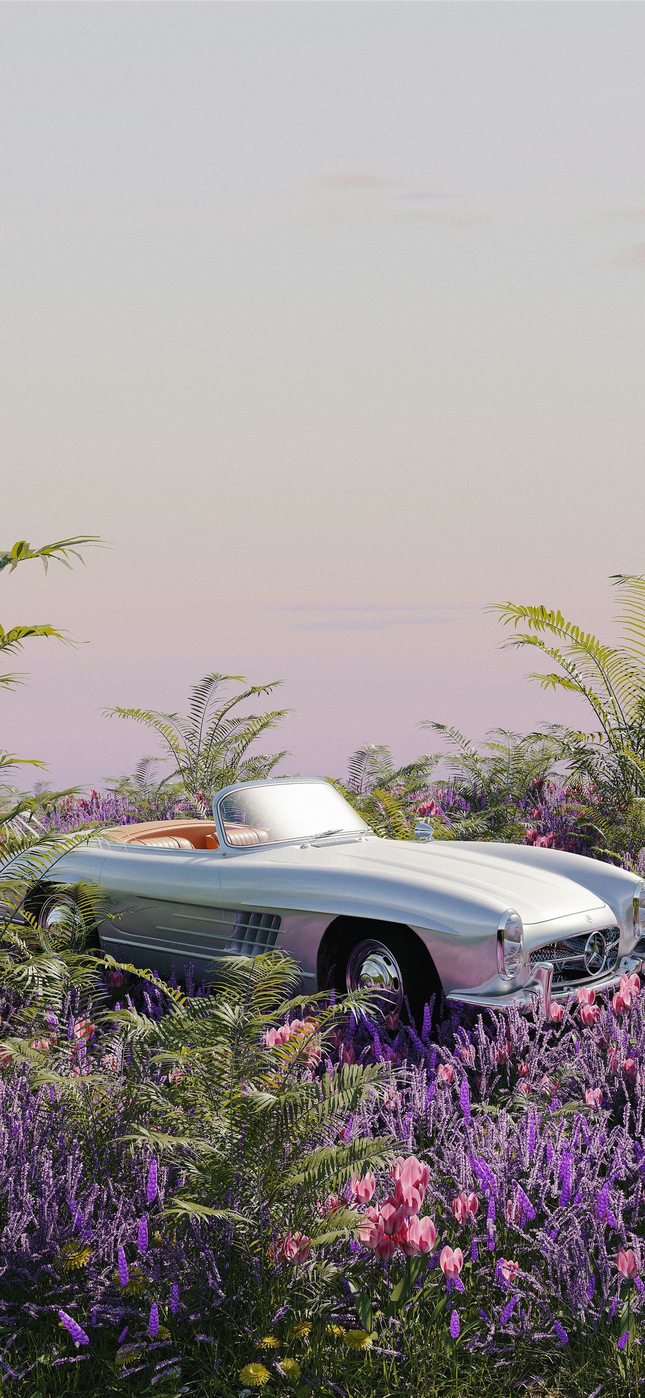 1290x2796 a car is parked in a field of flowers - flowers iPhone Wallpaper