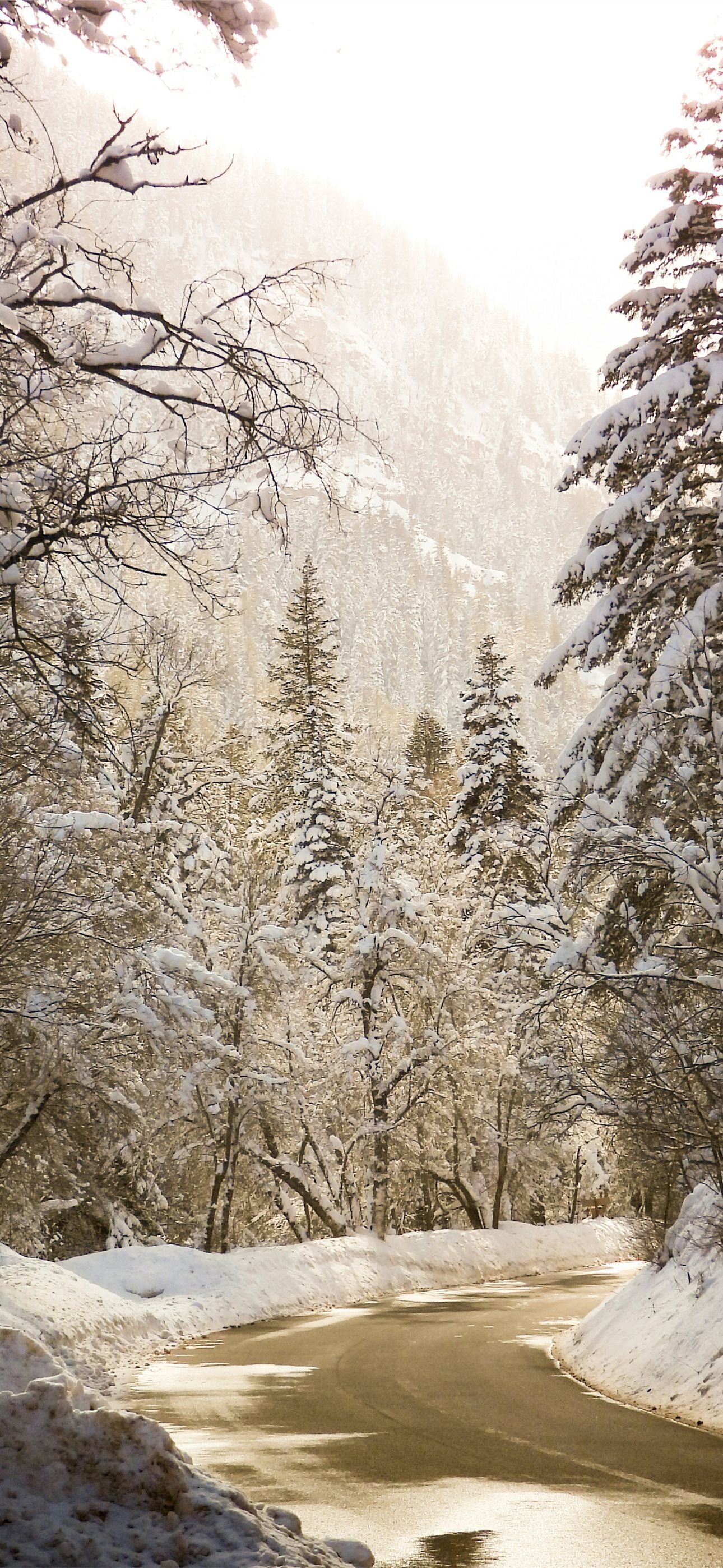 a snow covered road surrounded by trees and snow iPhone wallpaper