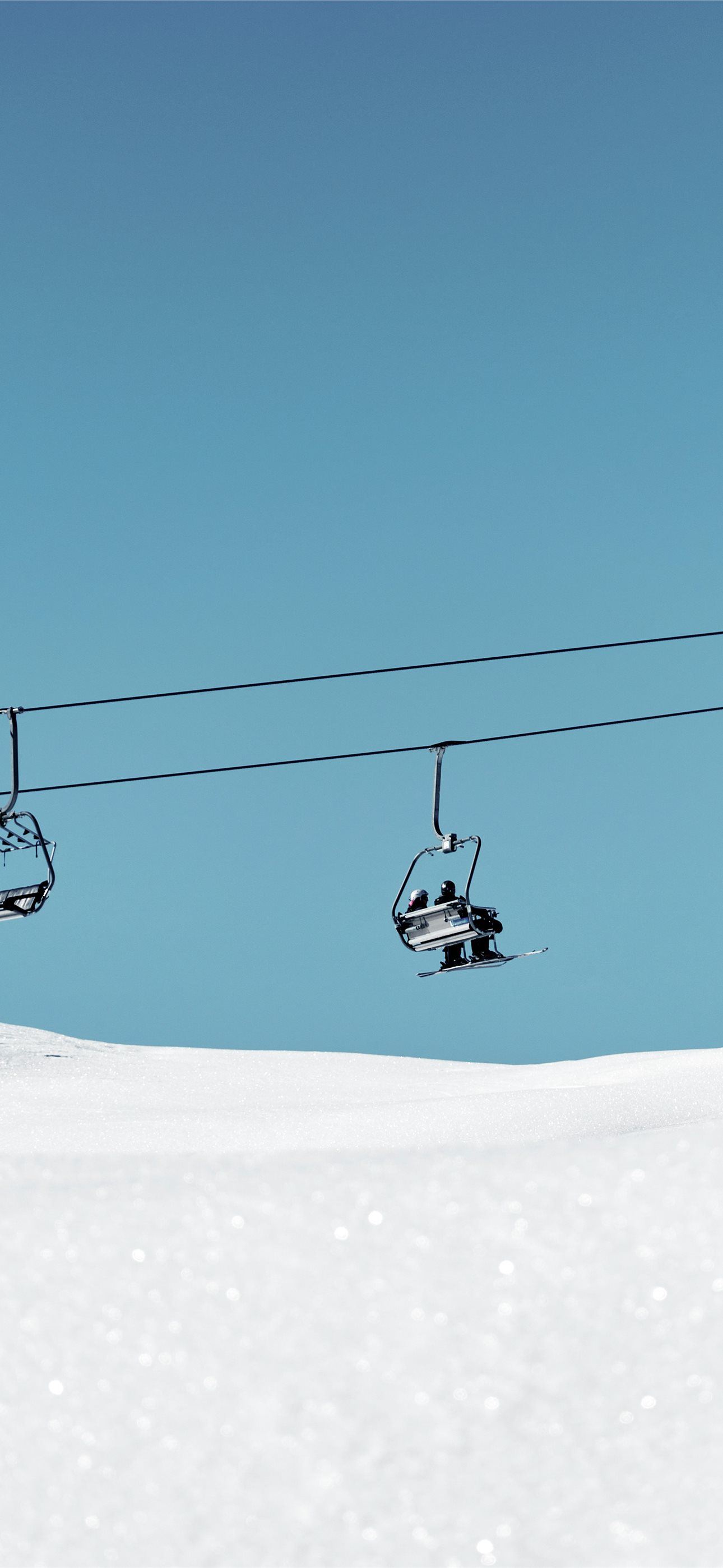 1290x2796 a ski lift with two skiers going up a snowy hill - outdoors iPhone Wallpaper