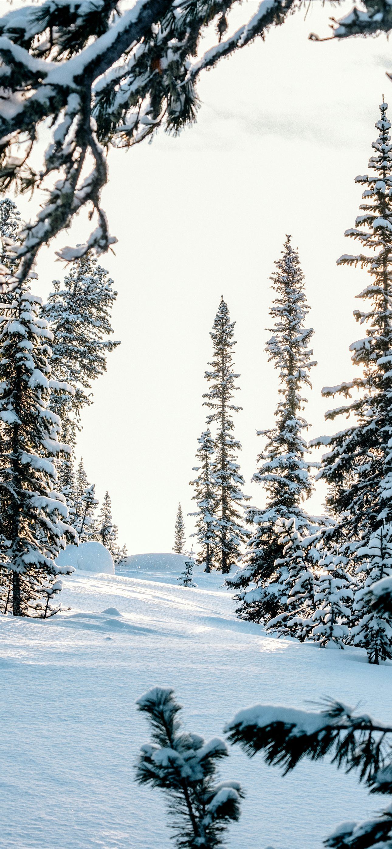 Sunlight shines through snow covered pine branches... iPhone wallpaper