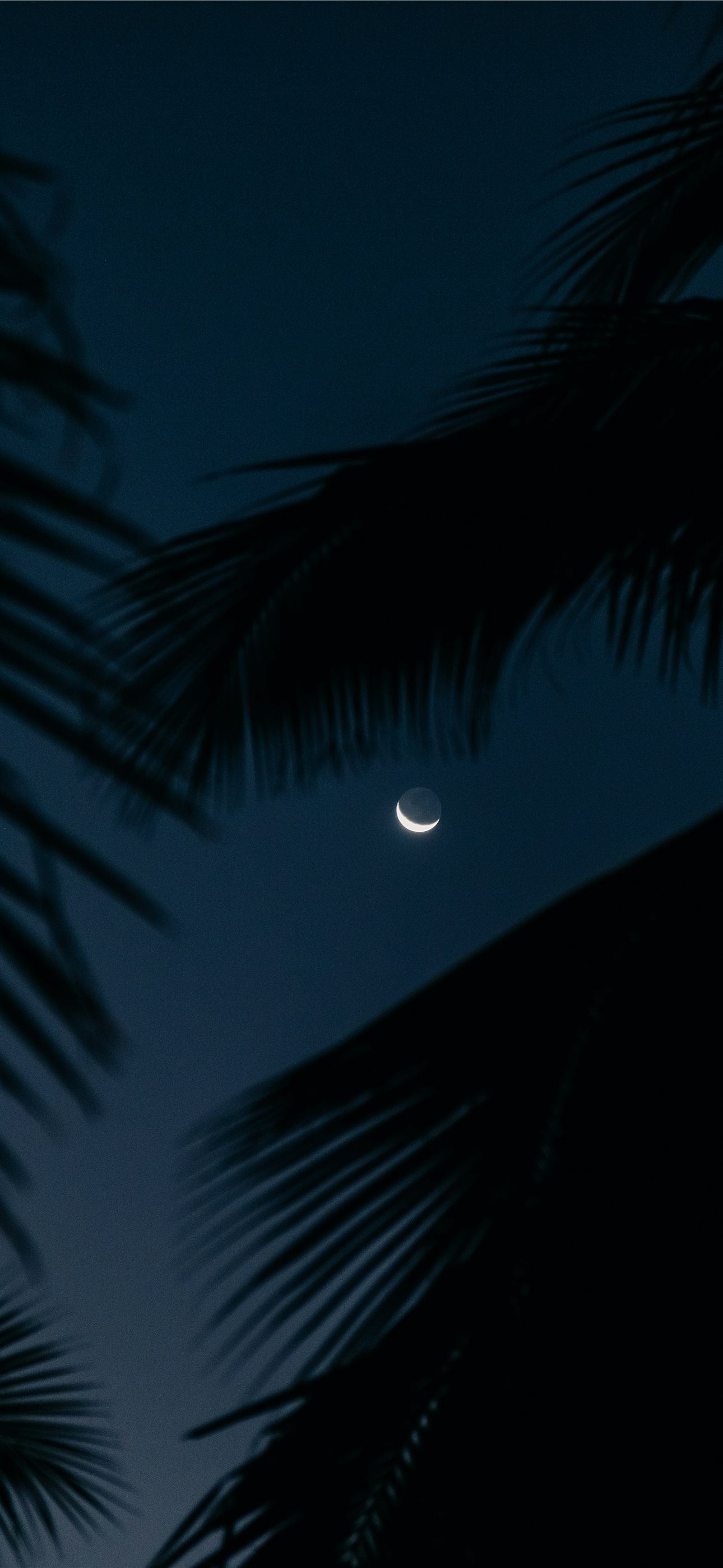 Crescent moon visible through palm fronds at night iPhone wallpaper