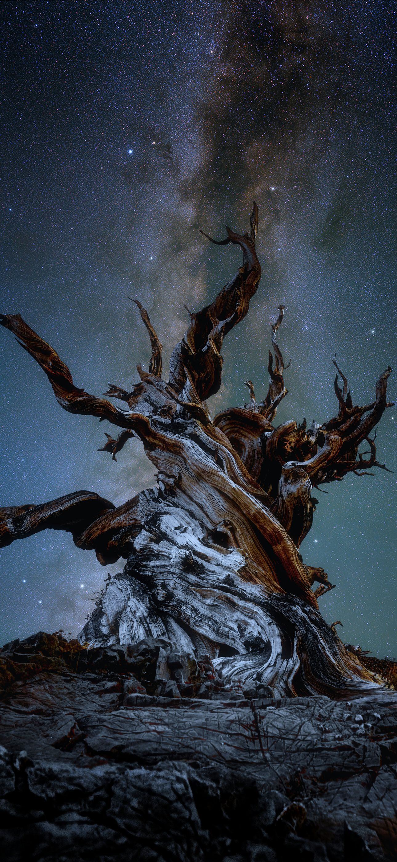 Ancient gnarled tree under a starry night sky iPhone wallpaper