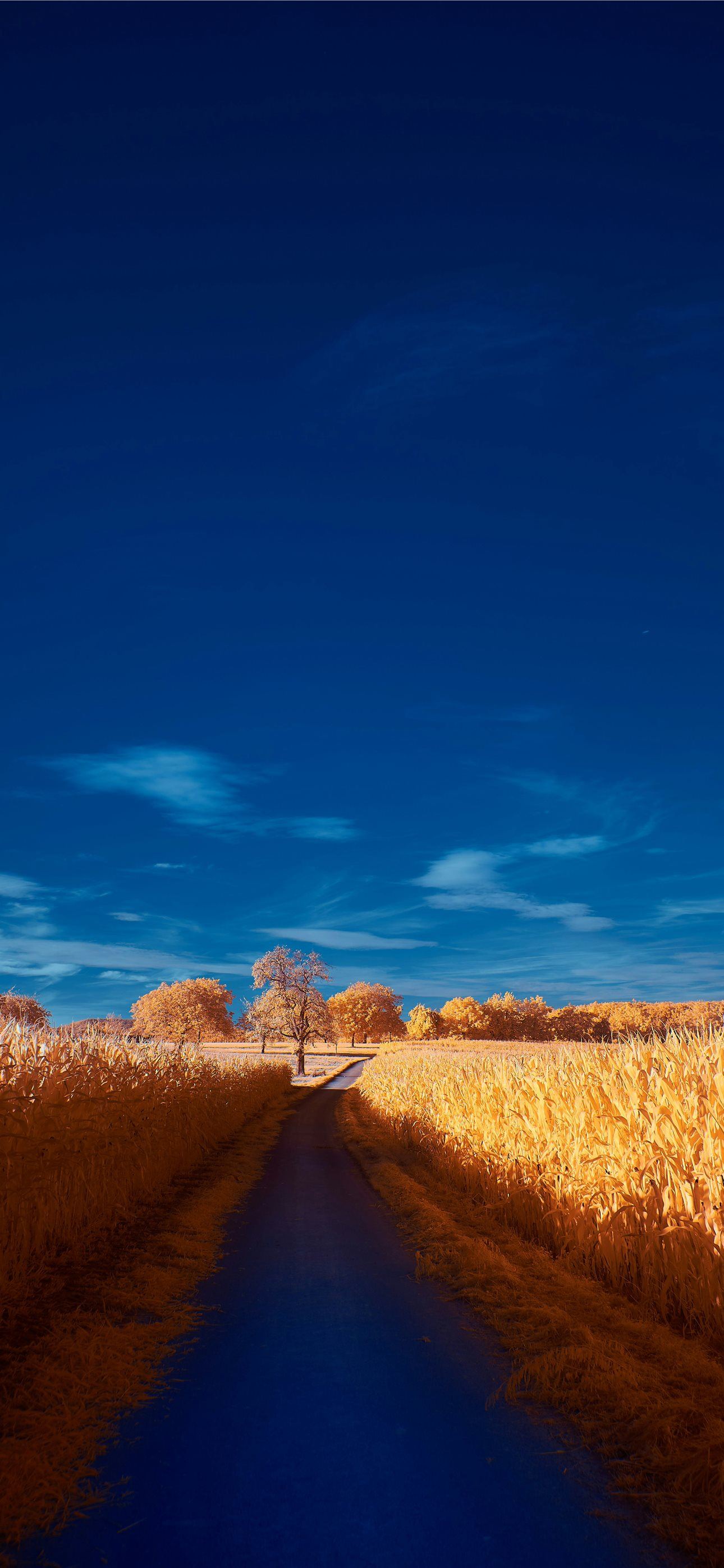 1290x2796 a road in a corn field with a blue sky in the back... - plant iPhone Wallpaper