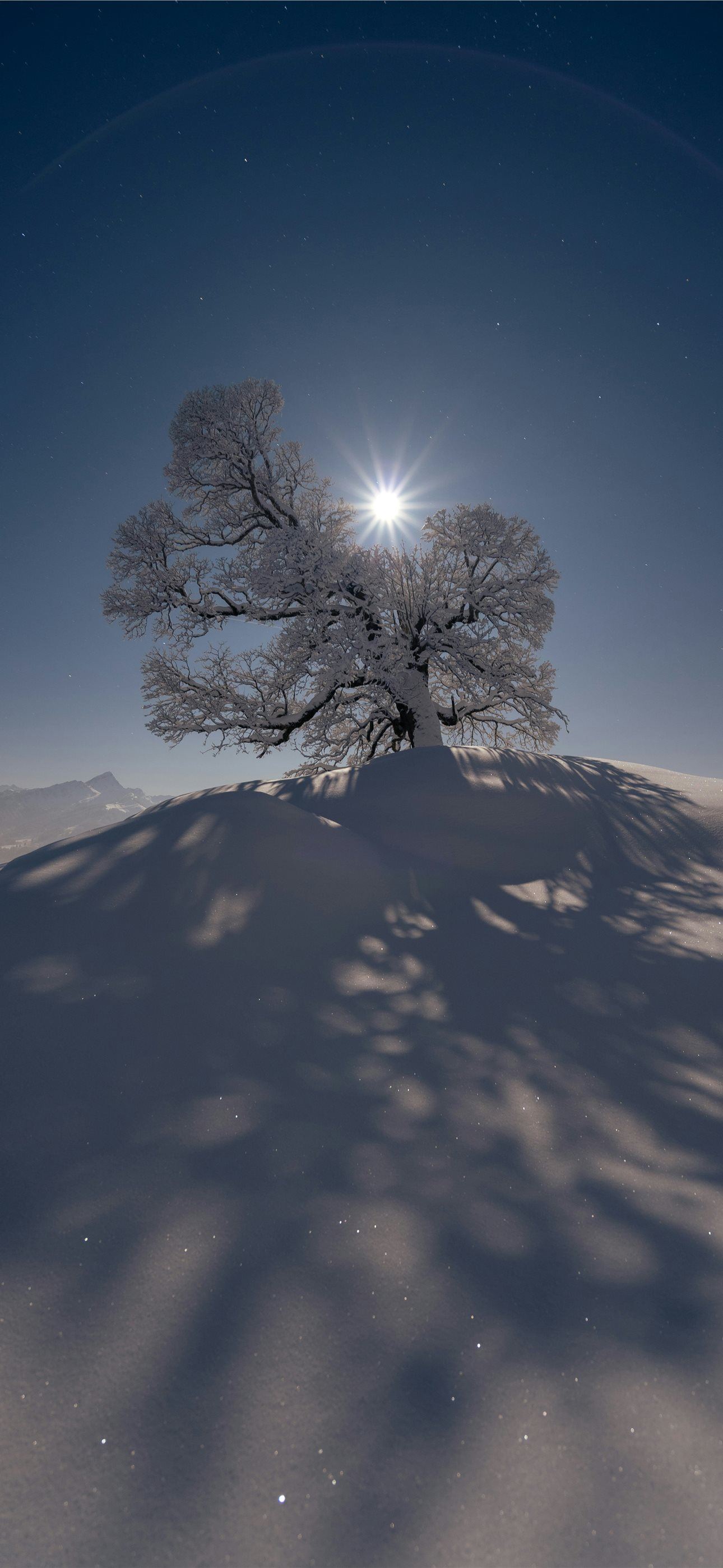 A snow covered hill with a tree on top of it iPhone wallpaper