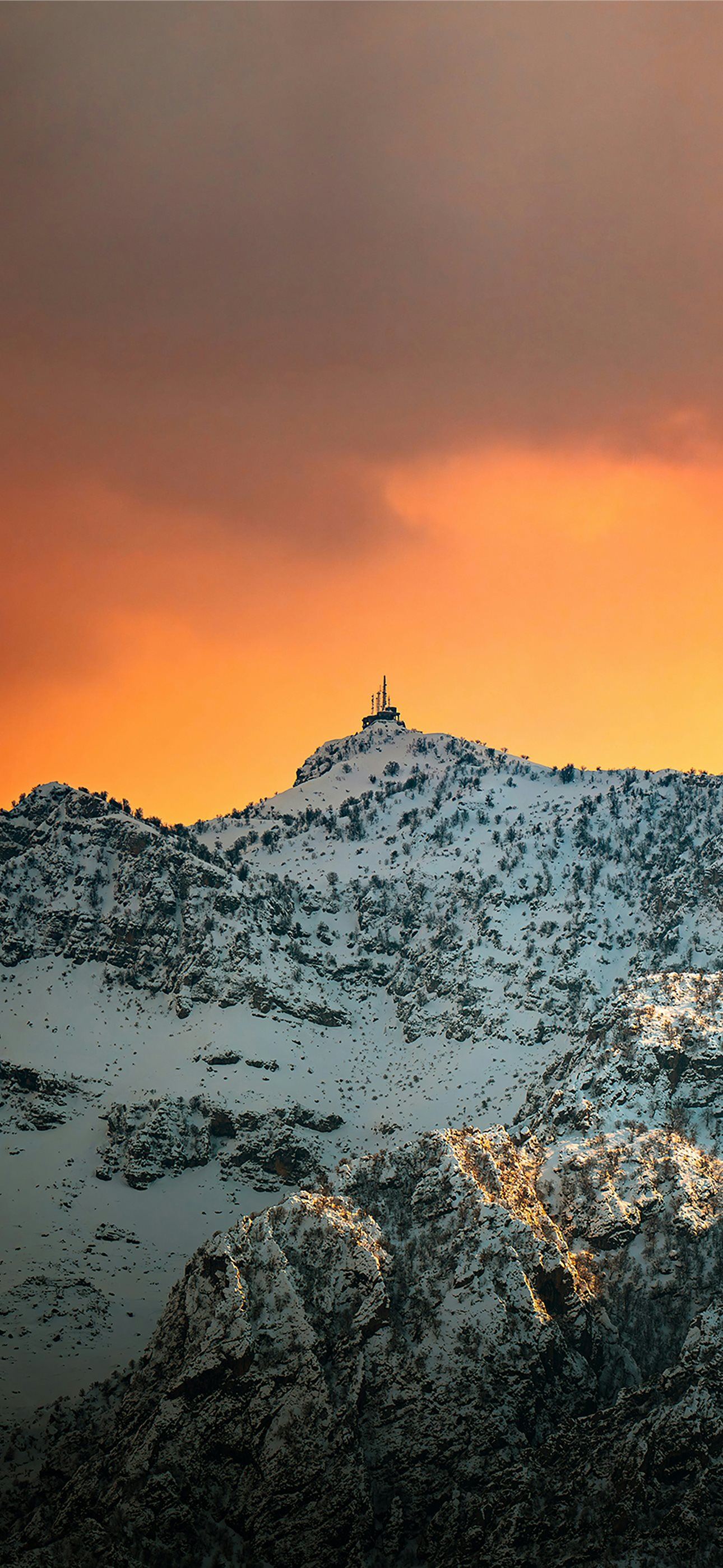 1290x2796 a snow covered mountain under a cloudy sky - winter iPhone Wallpaper